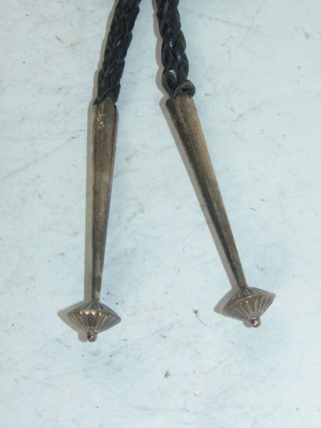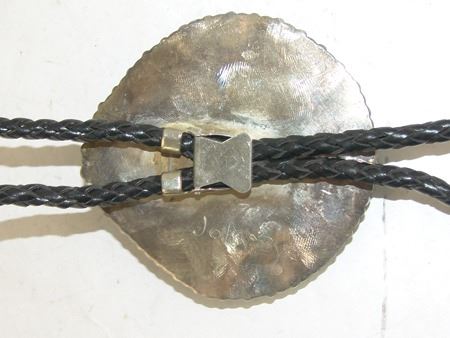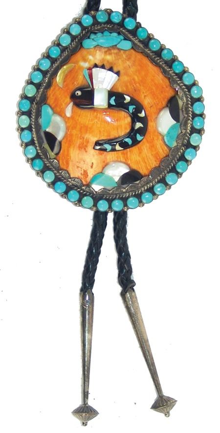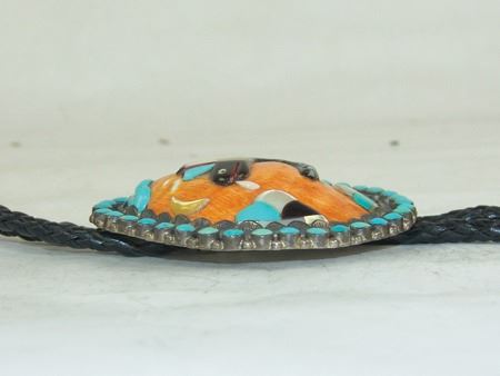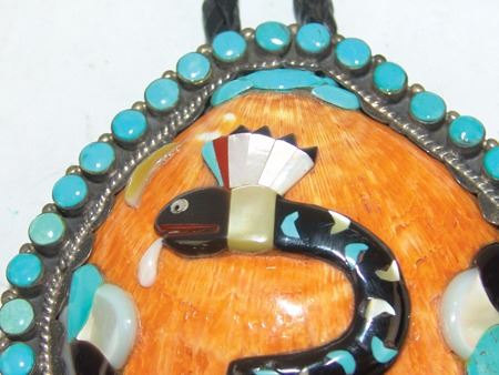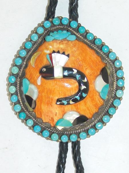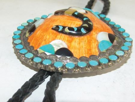 Ca. 1970s-1980s, Outstanding silver backed bolo holding a large orange spondulus shell with inlay/overlay serpent and silver tips, unsigned. Very good condition. 44" long, pendant 3-1/2" x 3"