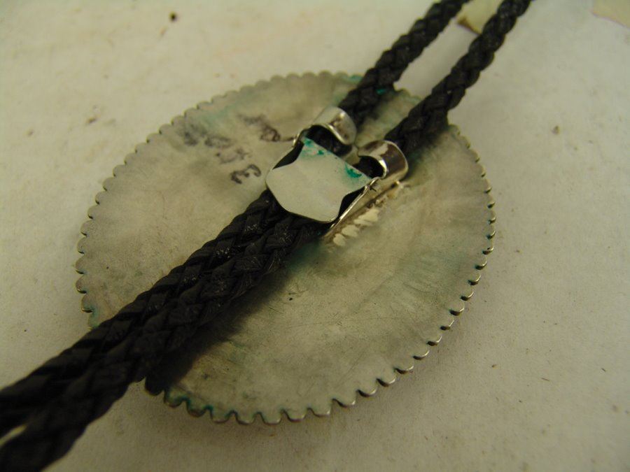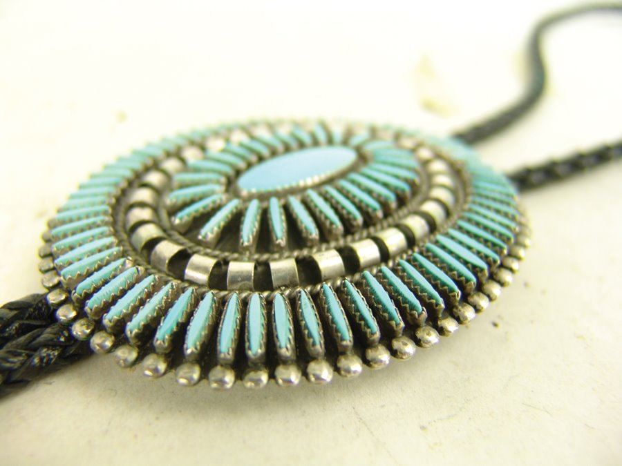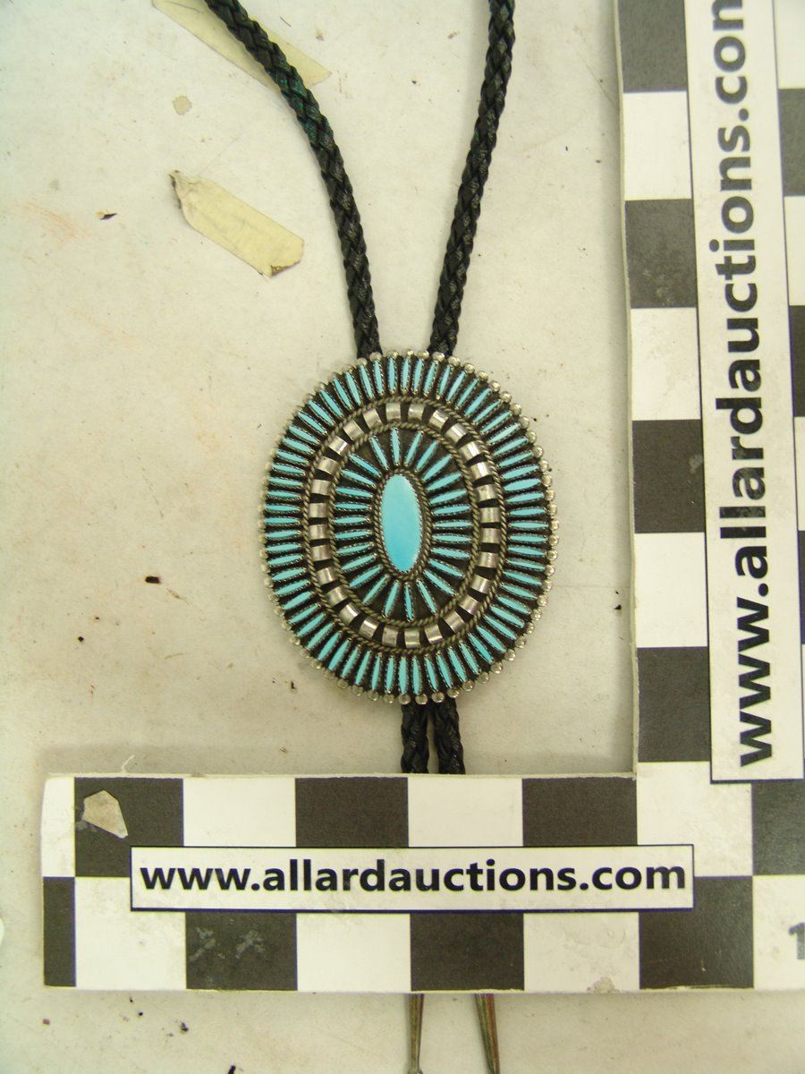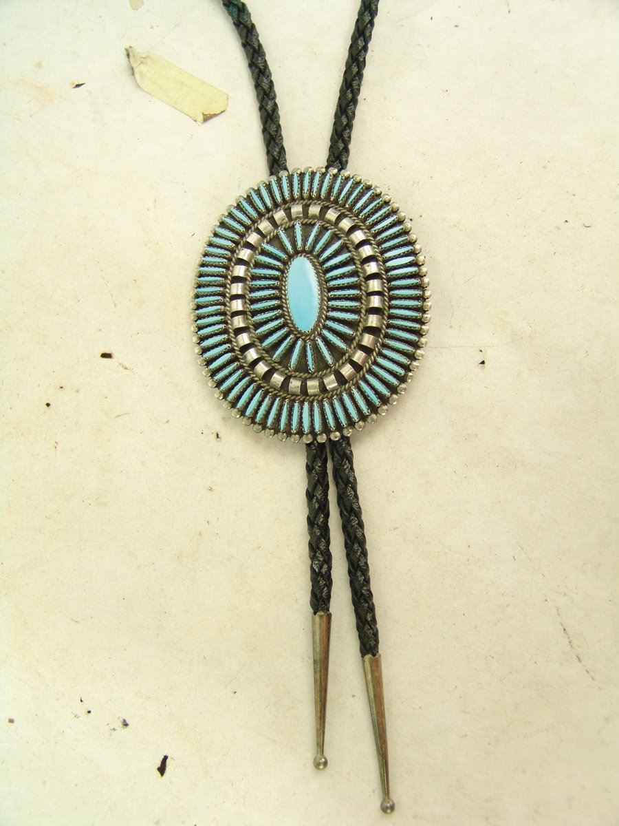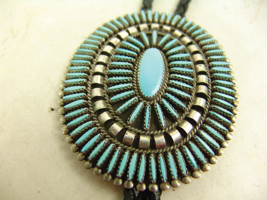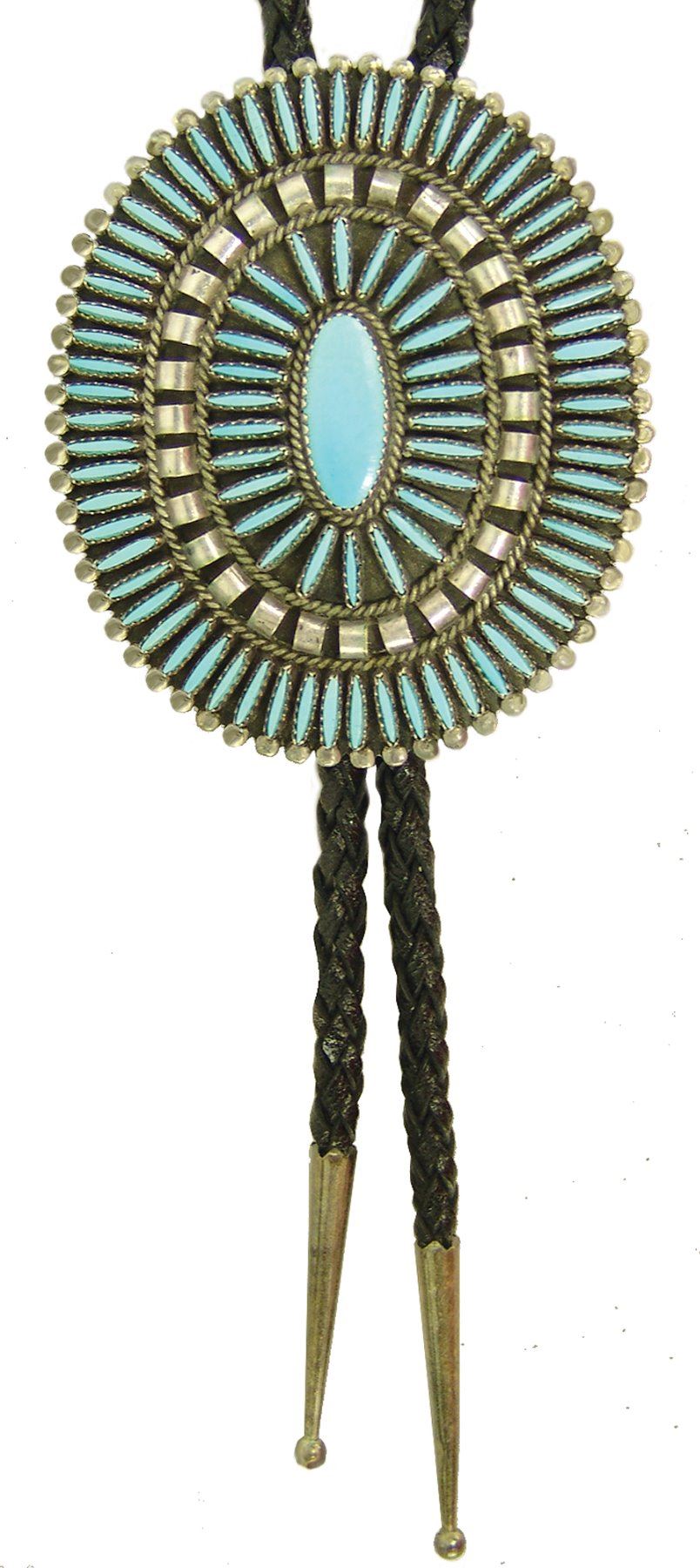 Superfine needlepoint design oval shaped all silver bolo tie with 90 individually hand cut and set turquoise slivers surrounding the single oval cabochon. Excellent condition.,,3-1/2" x 2-7/8"