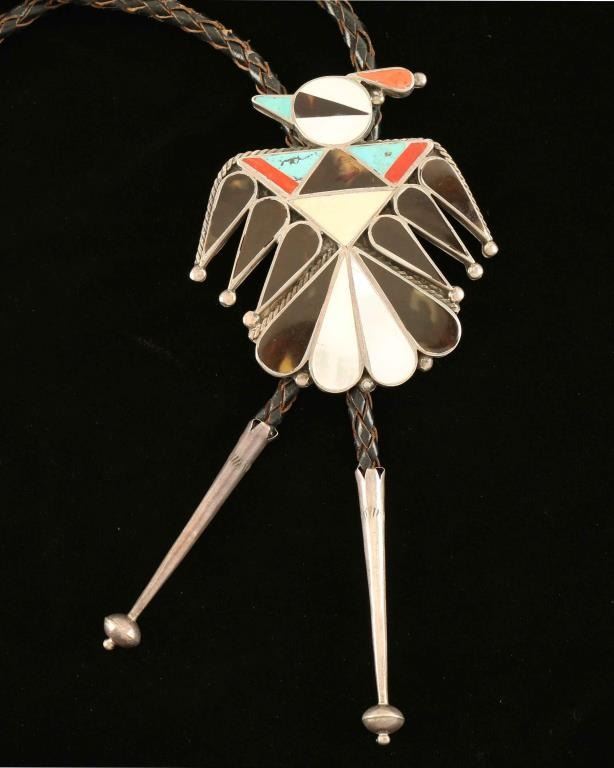 Thunderbird inlaid design set in sterling made by award winning silversmith Myra Tucson, circa 1950's.
