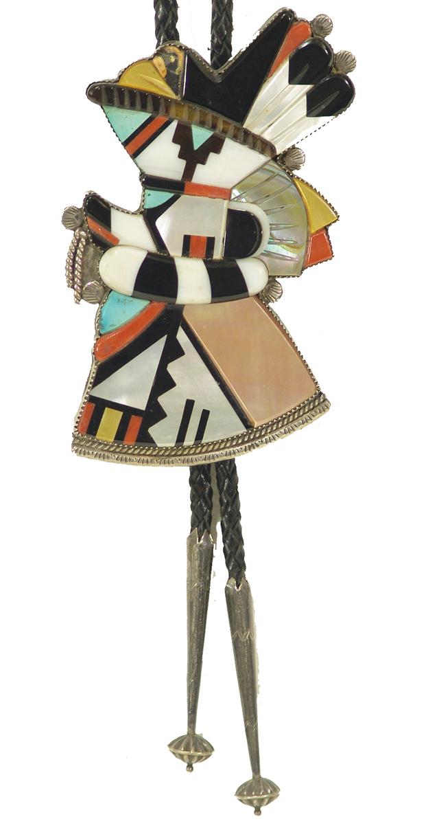 Circa 1970s, Andrew Dewa, Outstanding raised mosaic inlay silver bolo tie with blossom bead tips. 4-1/2" x 2-1/2"