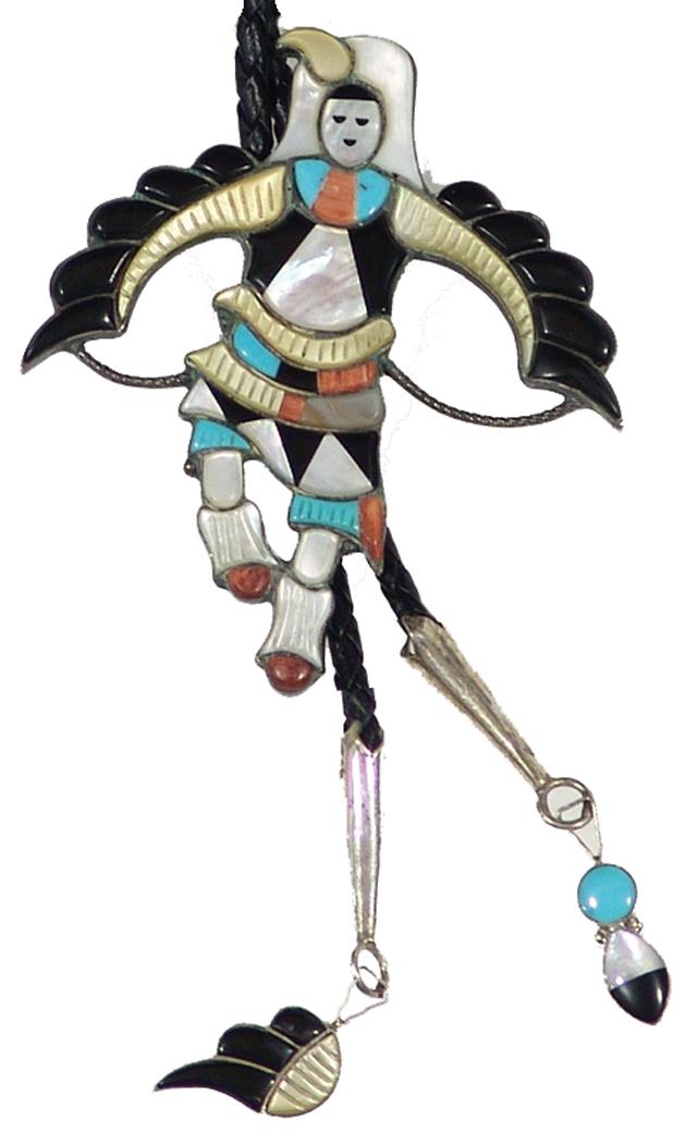 Circa 1980s, Beautiful, vintage, stone-on-stone inlay eagle dancer bolo of silver, turquoise, shell, jet and coral. 3-1/2"