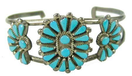 Ca. 1980s, Classic turquoise and silver needle point bracelet with 33 hand-cut and set stones. Very good condition. 5-1/4" + 1" x 1-1/8"