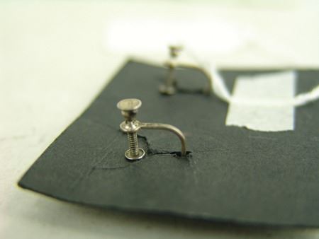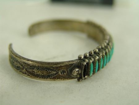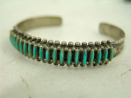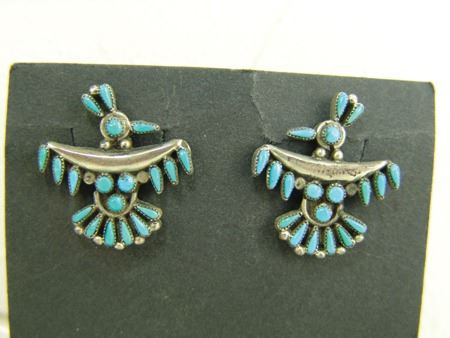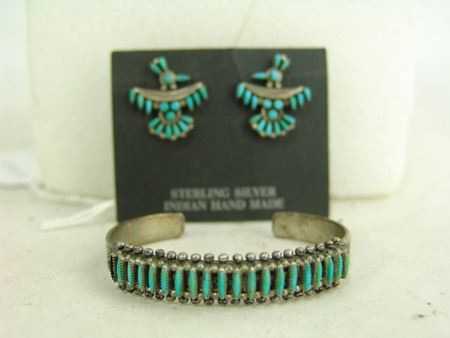 Mid 1900s, Vintage pair of screw-back turquoise and silver earrings in thunderbird form, plus a matching row bracelet, both done in traditional petit point style. Very good condition. 4-5/8" + 1" x 5/8"