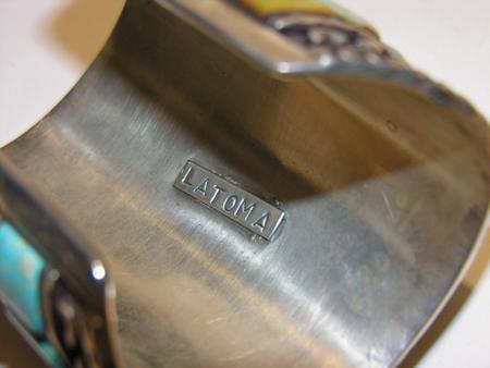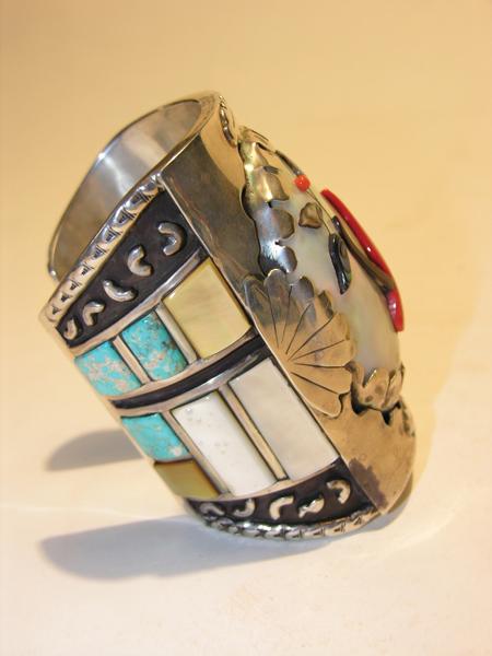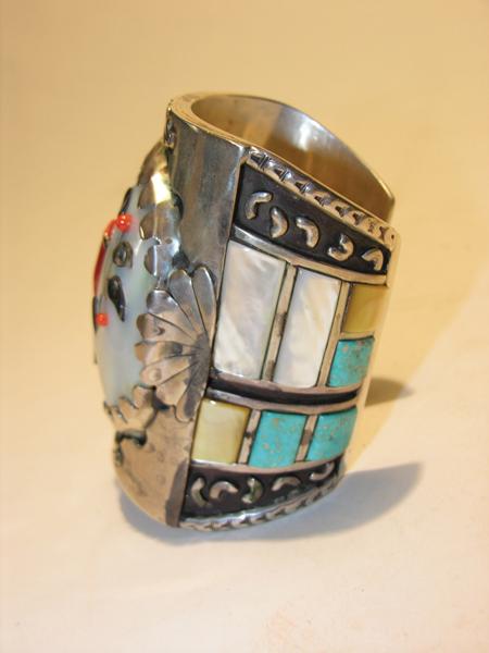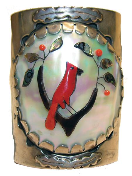 Circa Mid 1900s, Large Zuni sterling cuff with coral cardinal on jet branch surrounded by mother-of-pearl. Turquoise and shell stones set in sides with raised overlay. Ex: Bill McGee collection. 7-5/8" x 4" + 1-3/8" gap