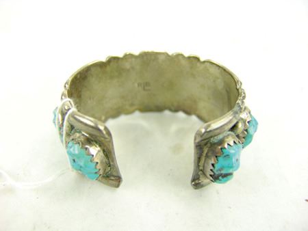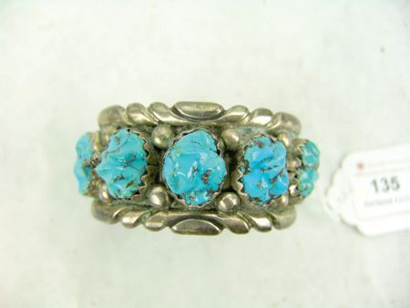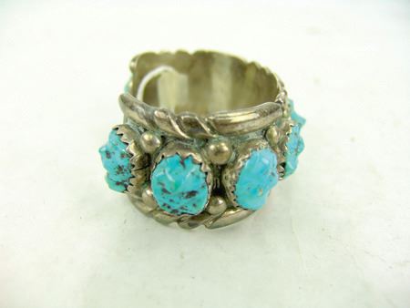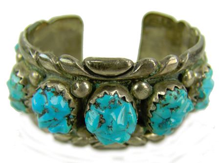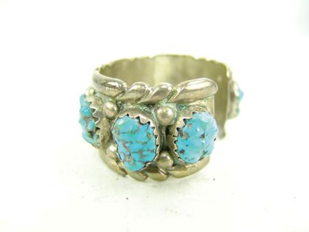 Ca. 1970s, Impressive heavy gauge all-silver cuff bracelet with nine large soft-faceted turquoise nugget stones. Very good condition, nice patina. 5-1/4" +1" x 1-1/4"