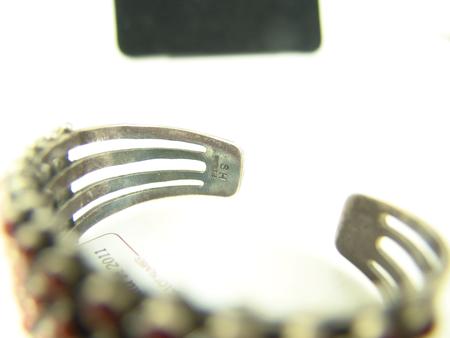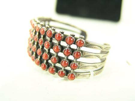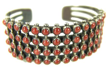 Circa 1980s, Fine four-row silver cuff bracelet set with 60 tiny coral stones. Very good condition, hallmark "SH." 5-3/4" x 1" + 7/8" gap
