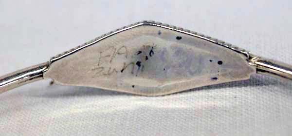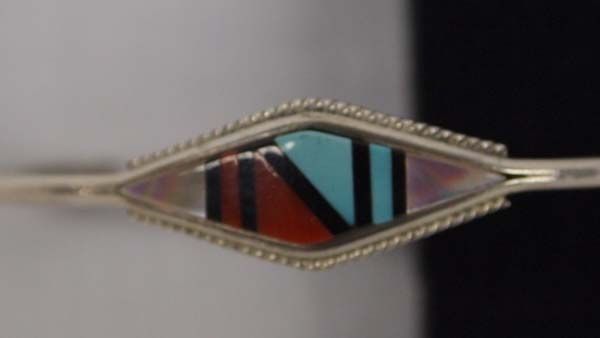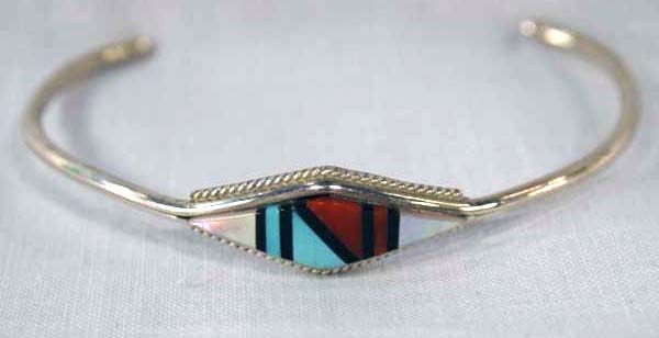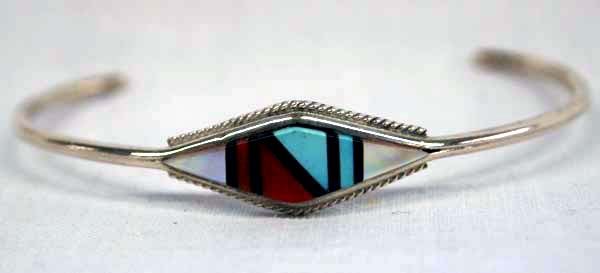 Zuni Bracelet Sterling & Inlays, Signed ''FA''. Stone to stone inlays of mother of pearl, turquoise, coral and jet. Bracelet measures 6 3/8'', inside dimension, 1/4'' in width. Signed ''FA Zuni''.
