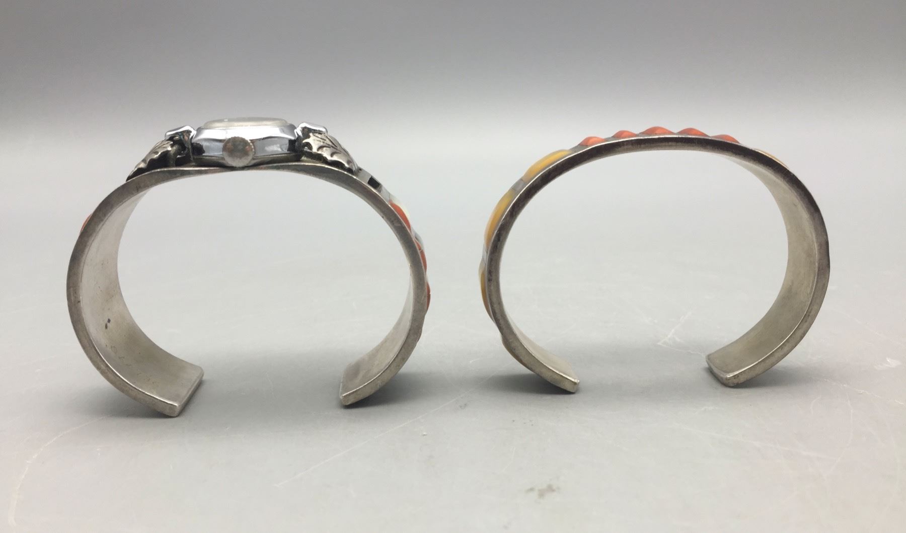 Description: For sale in this lot we have a vintage Zuni inlay bracelet and watch. Both featuring shell and coral set in sterling silver. Maker: Various. Approx. Age: Vintage. Size: Various, combined weight is 94.7 grams. Condition: Good for its age, normal wear expected. Please look closely at the pictures - they are an important part of our description. Shipping: There will be a $5 handling, packaging fee for shipping this lot. The actual cost of postage will be added on top of that.