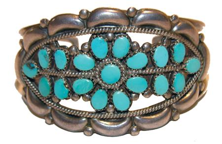 Circa Mid 1900s, Zuni turquoise cluster on double band sterling. Hallmark Fred and Elsie. 6-1/8" x 1-1/2" + 1" gap