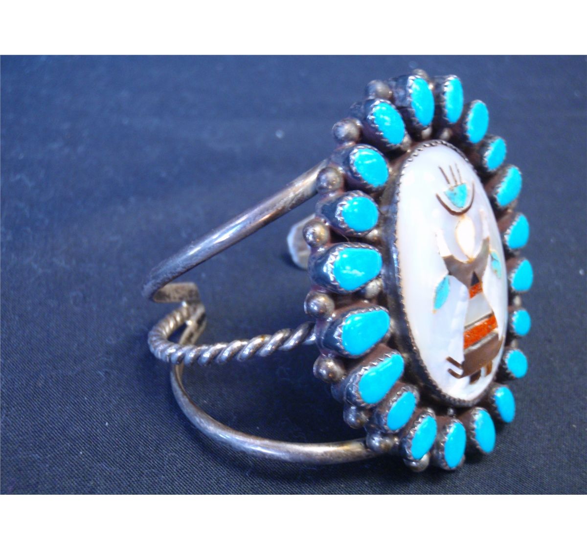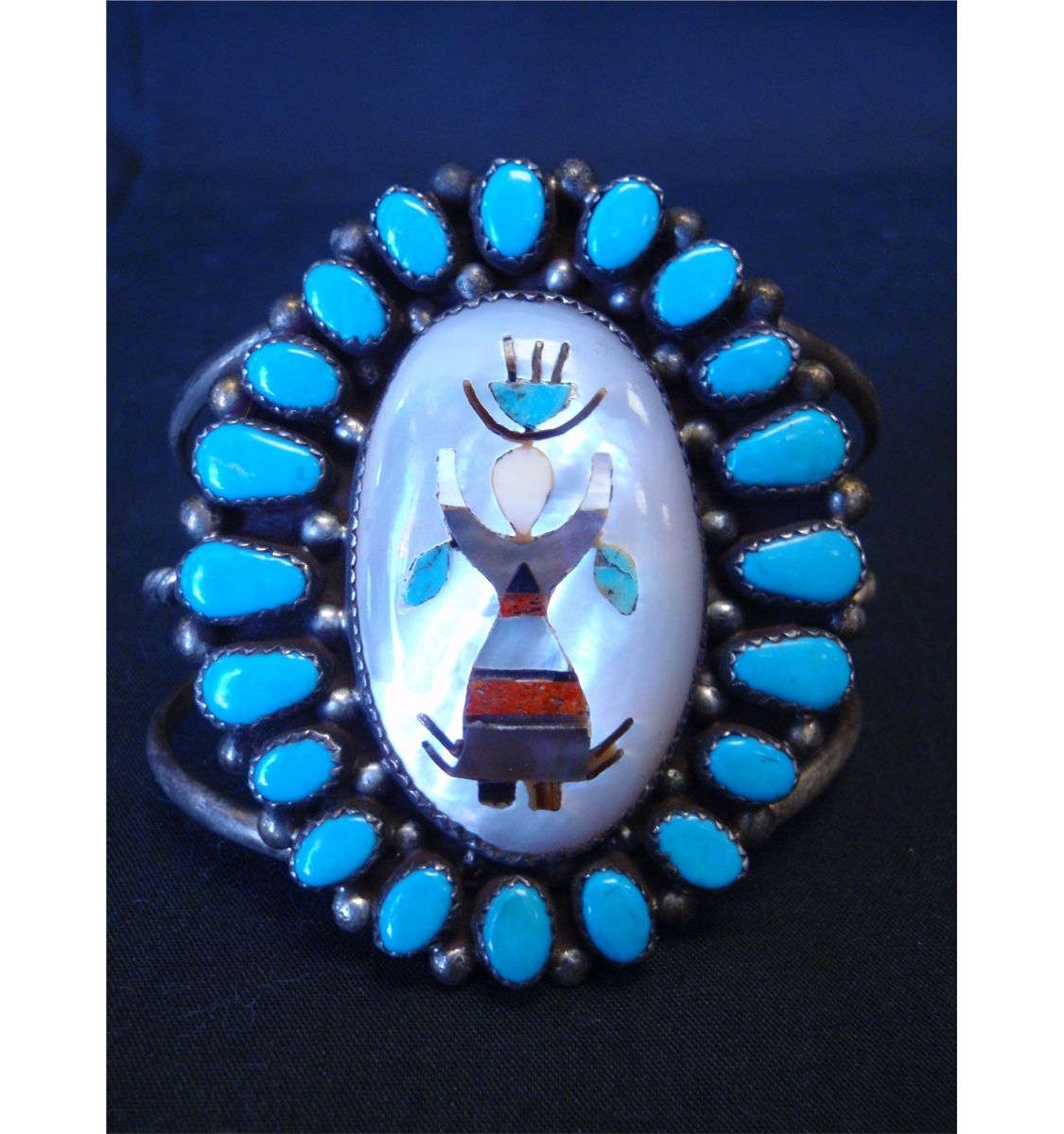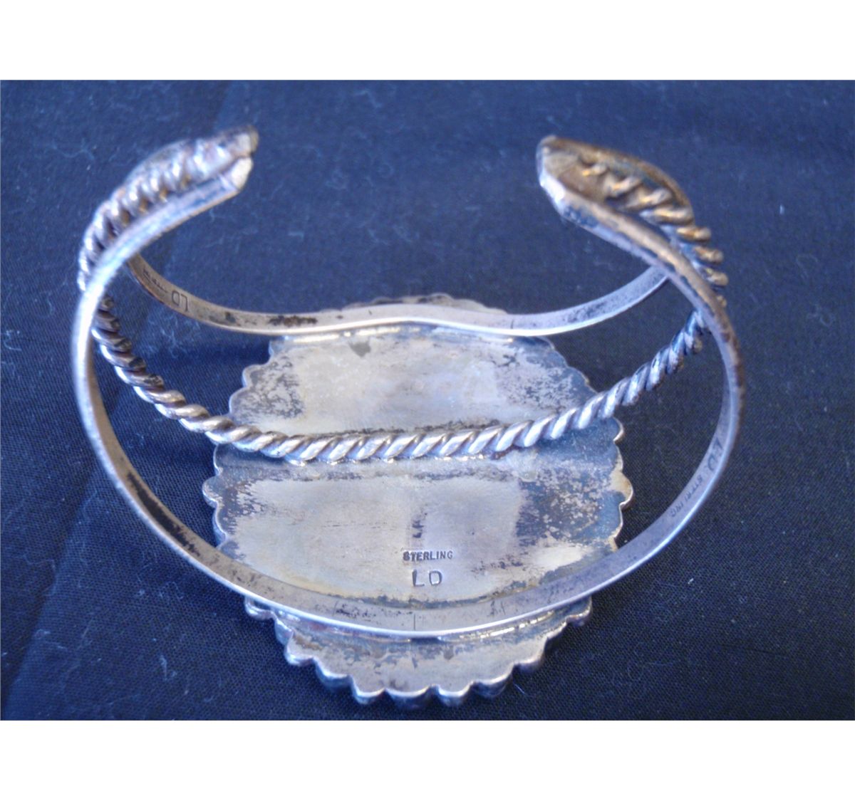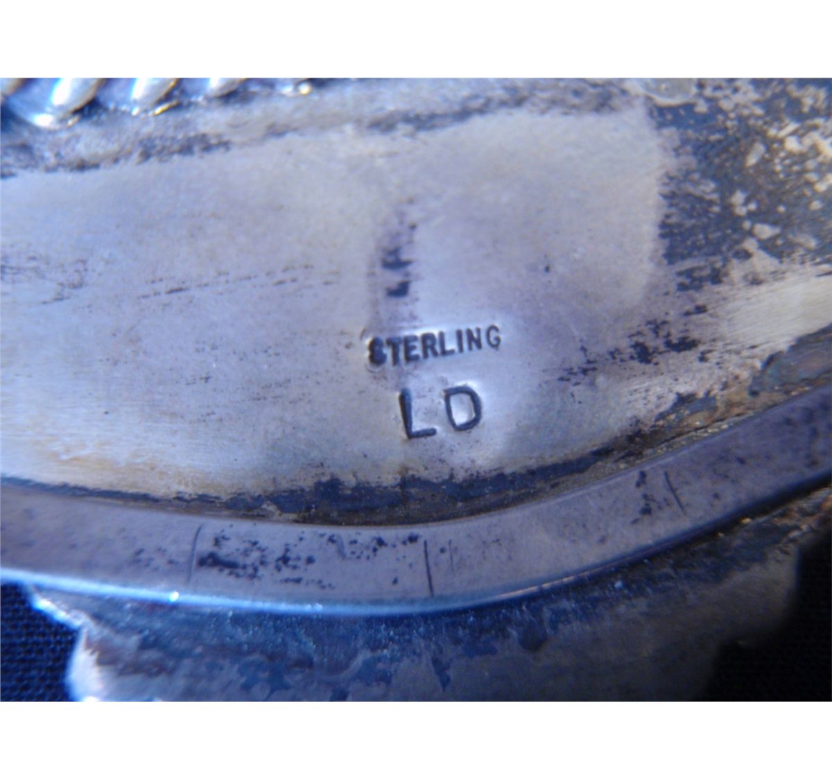 Inlaid oval center with bright blue turquoise stones around. Stamped "Sterling L.D." Measures: Inner circumference: 5 1/2" (End to end, no gap) Gap (Where your wrist enters) 1" Shipping on this lot: $10.00. Additional Shipping Charges for Lots sent outside of the U.S