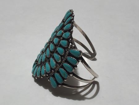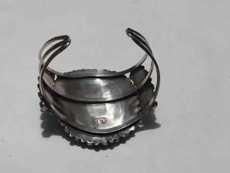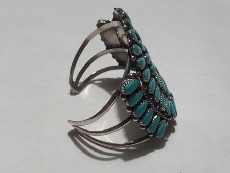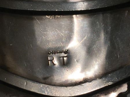 Mid 1900s, Classic turquoise and silver cluster design three-band bracelet with matched oval turquoise cabochons in sawtooth bezels; hallmark RT. 5-3/8" x 1-1/8" x 2-1/2"