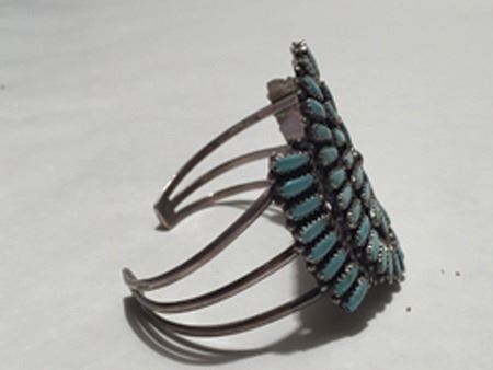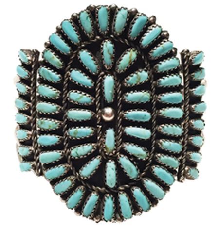Mid 1900s, Beautiful three-band oval cluster petit point turquoise bracelet. 5-3/4" + 1-1/8" x 2-1/8"