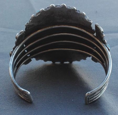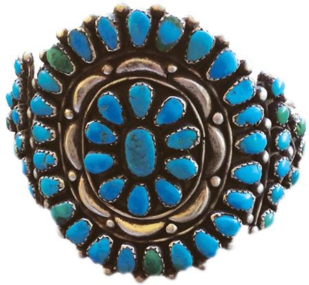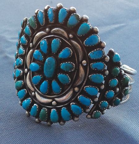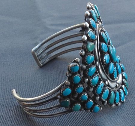 Ca. 1970s, Beautiful wide silver and turquoise Zuni cluster bracelet. Very good condition. 5-1/2" + 1-1/4" x 3"