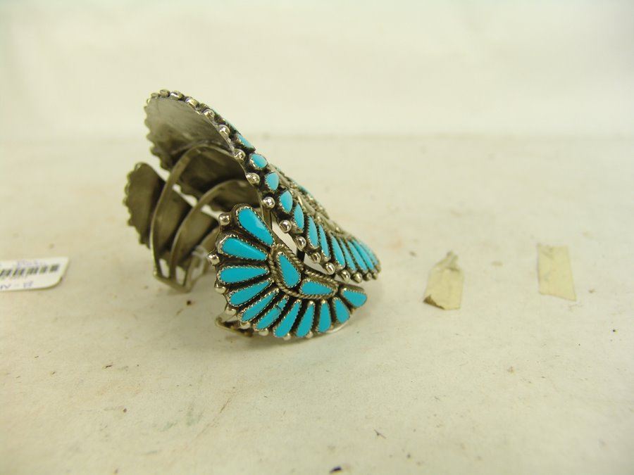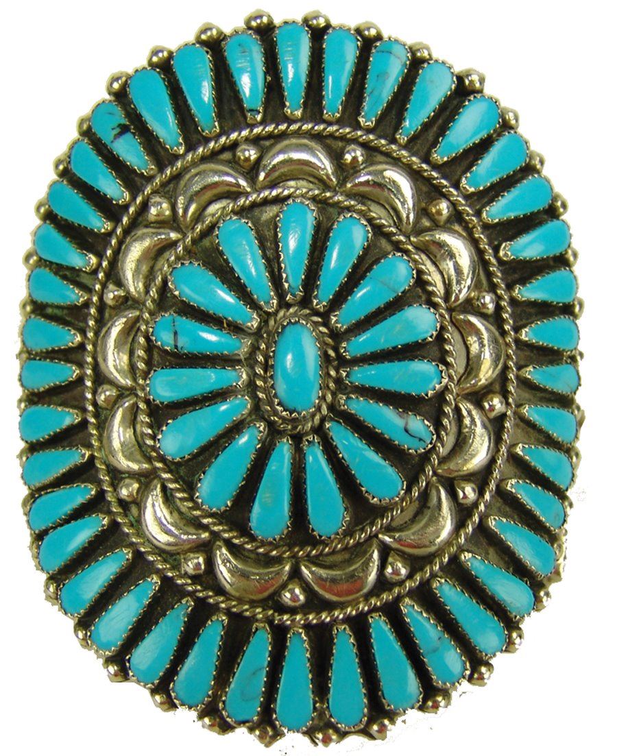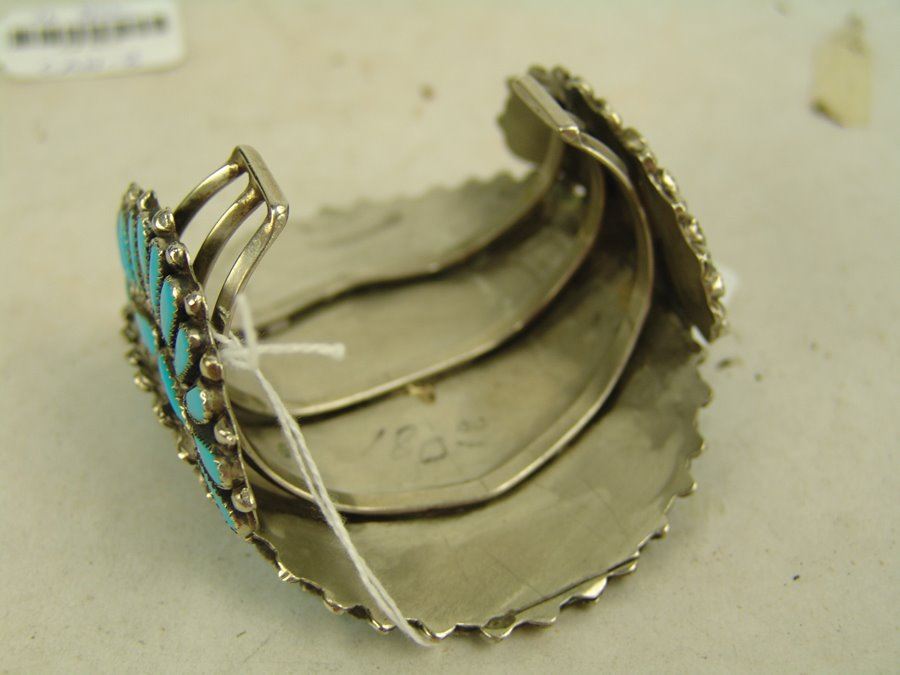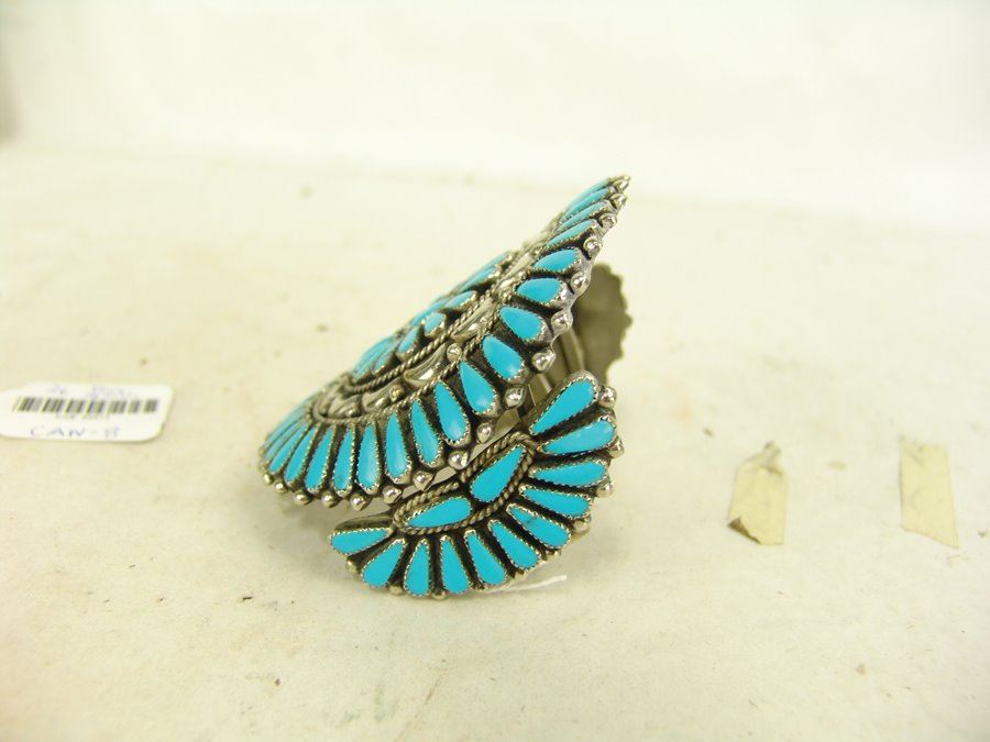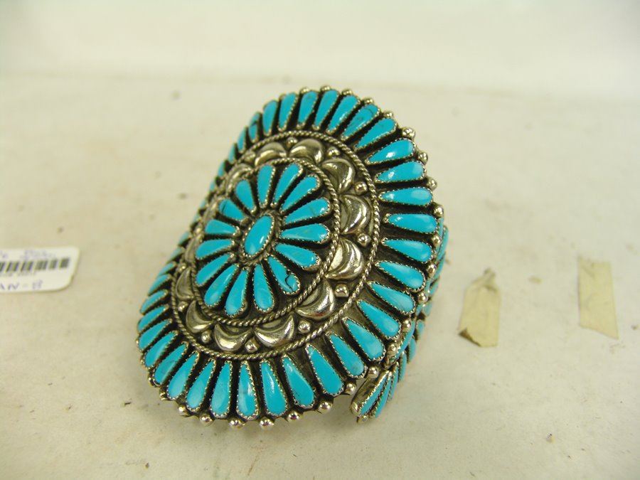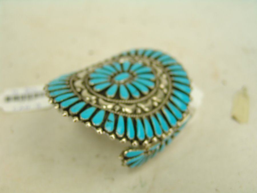 Classic turquoise and silver cluster design bracelet with larger than average rosette on the top and two smaller half rosettes on the sides. Very good condition. With 82 hand cut and set oval and teardrop Cabochons.,Ca. 1980s,5-1/4" x 1-1/2" x 3-3/4"