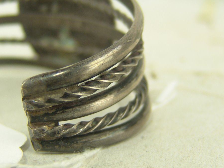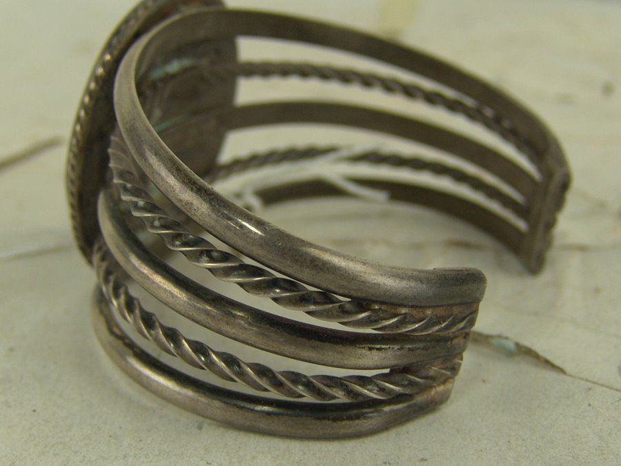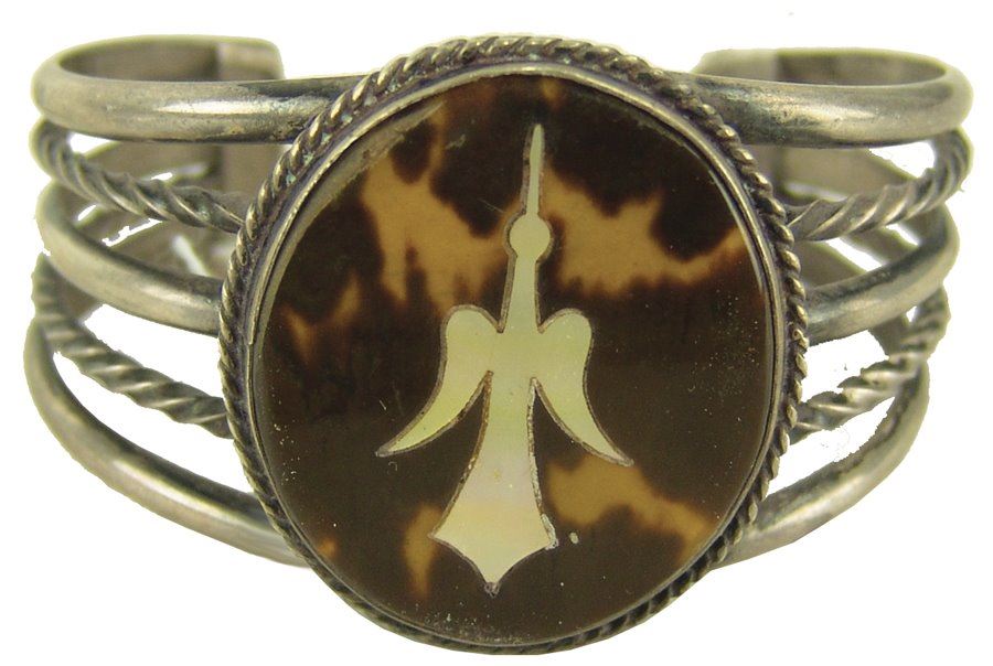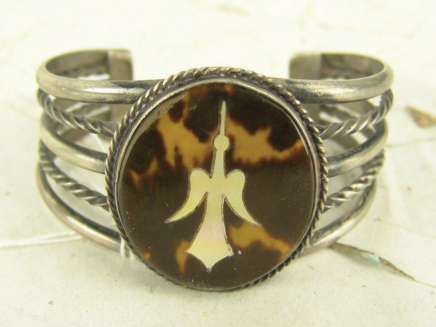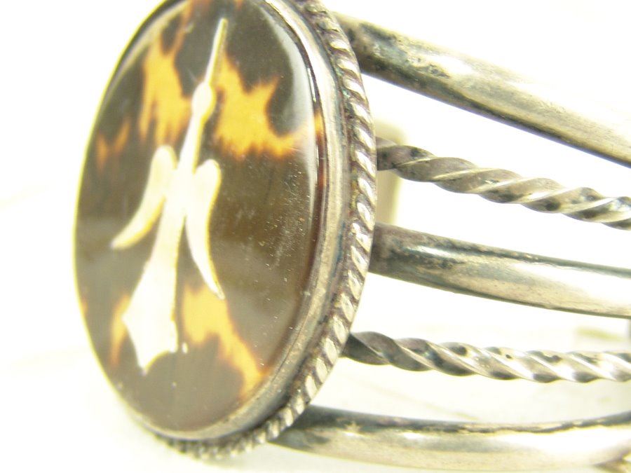 Vintage five-band all silver bracelet with peyote bird inlay in tortoise shell. Very good condition.,Ca. 1970s,6 1/2" + 1 3/8" x 1 5/8"