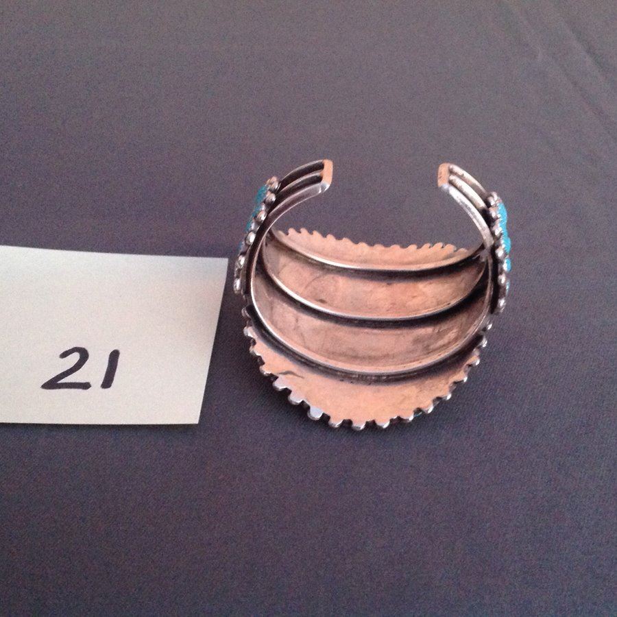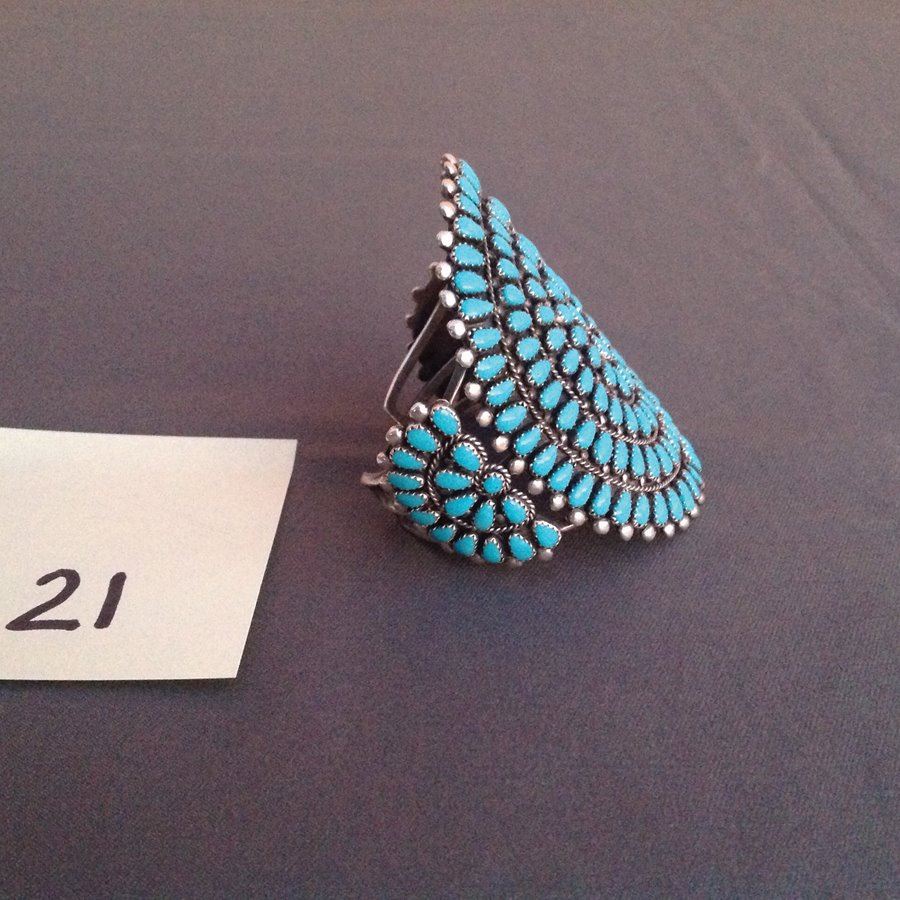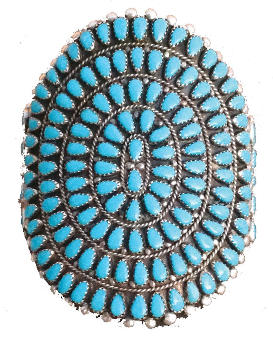 Classic large cluster design turquoise and silver bracelet with 152 matching hand cut and set teardrop shaped stones. Very good condition.,Ca. 1970s,5 1/2" x 1 1/2" x 3 1/2"W