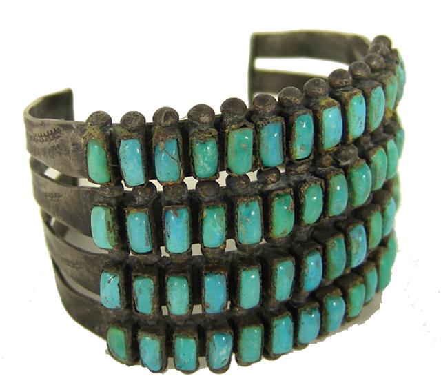 Circa 1940s, Rare Old Pawn hand wrought silver and turquoise four-row bracelet set with 52 hand cut natural Kingman turquoise cabochons. 5-1/2" plus 1-1/2" gap x 2-1/4" wide