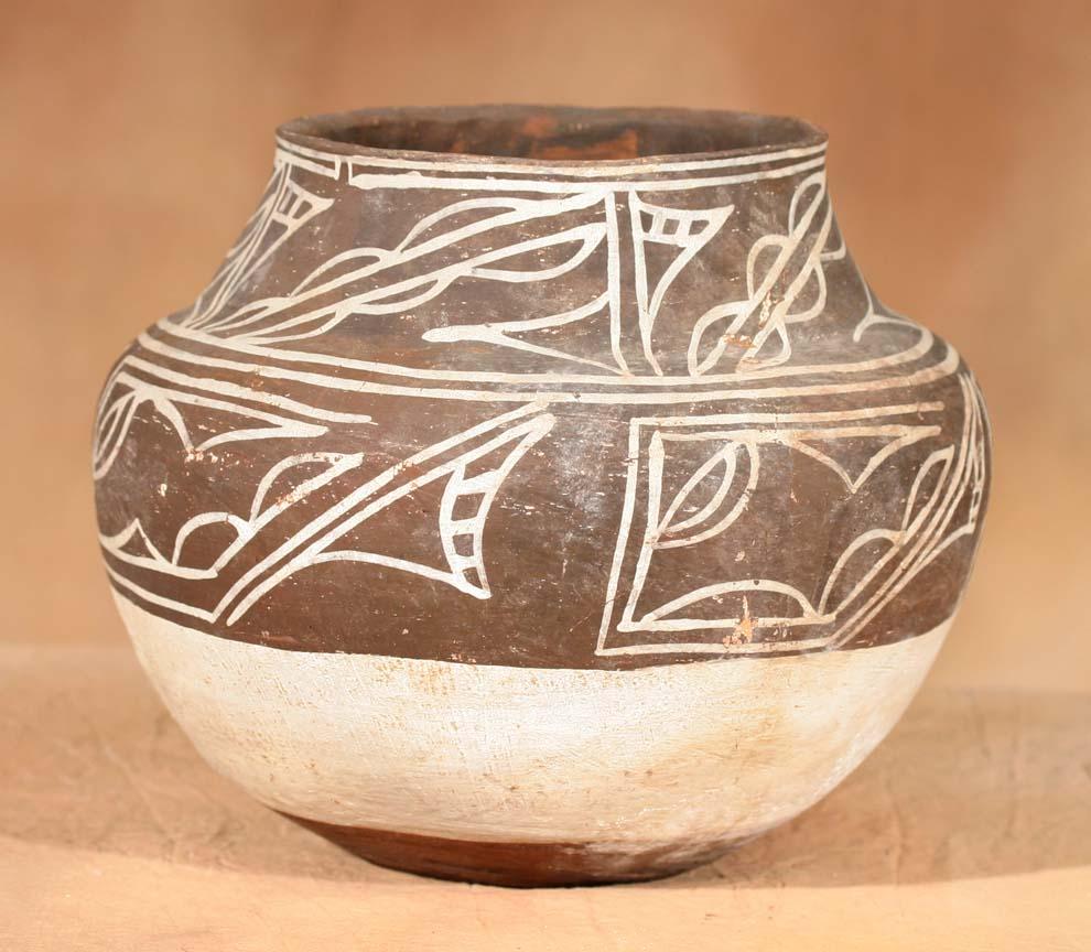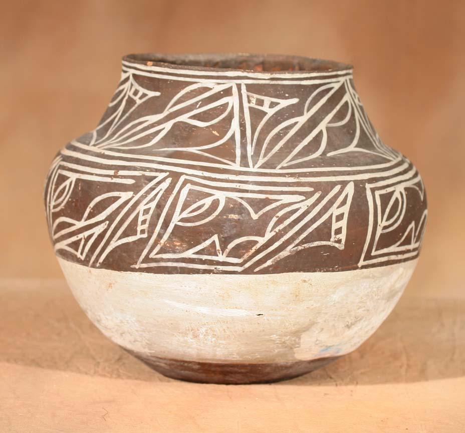 Zuni Brown & White Jar. 9" x 9 ½". Early abstract designs. Circa 1880-90. (est $2,000-2,500). Provenance: Bethany College, Lindsborg, KS. For condition reports please visit: www.auctioninsantafe.com/cr2011.pdf