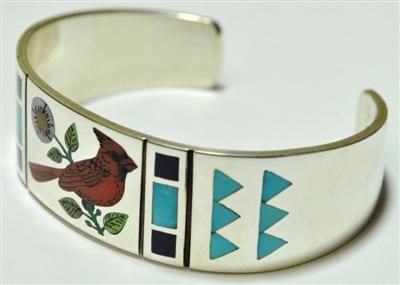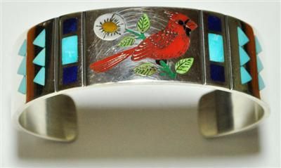 Zuni Cardinal Inlay Sterling Silver Cuff Bracelet - Rudell & Nancy Laconsello