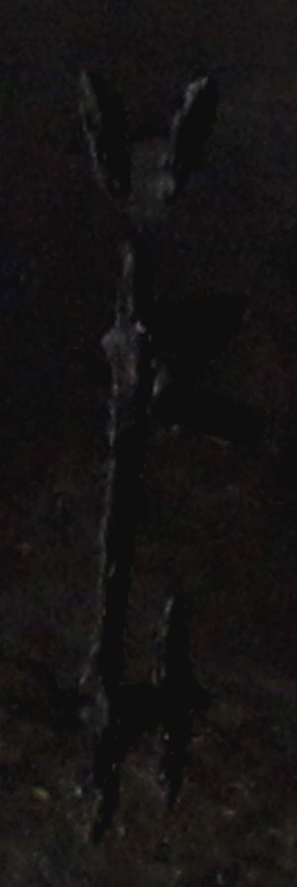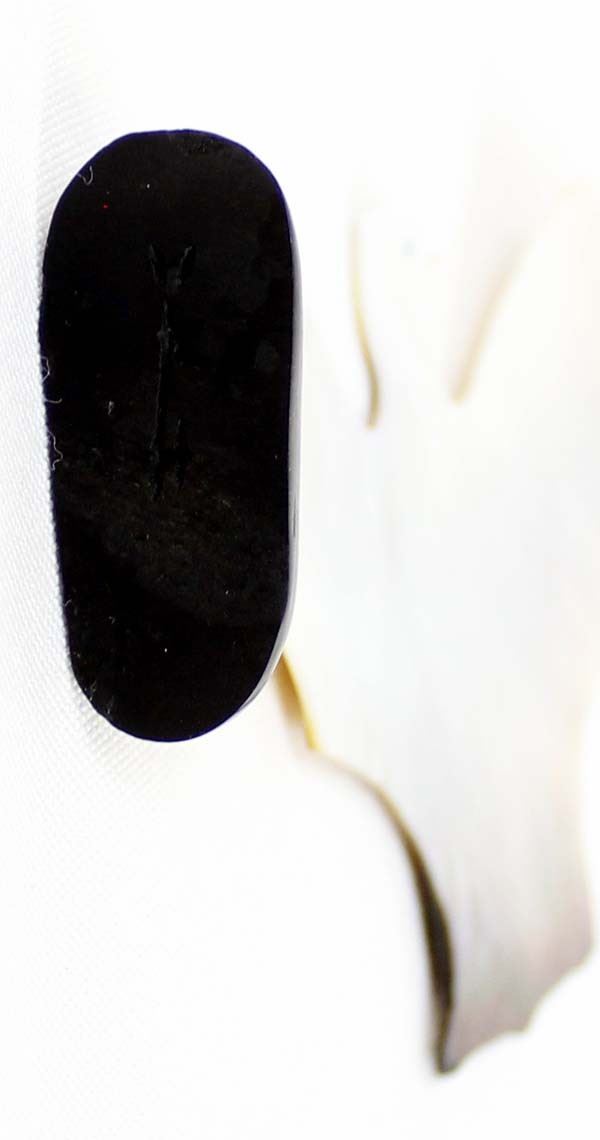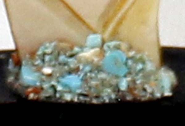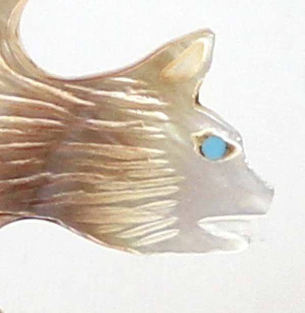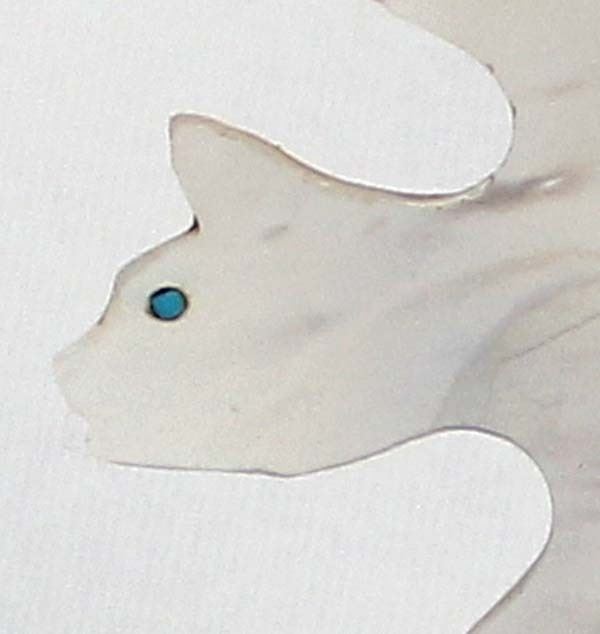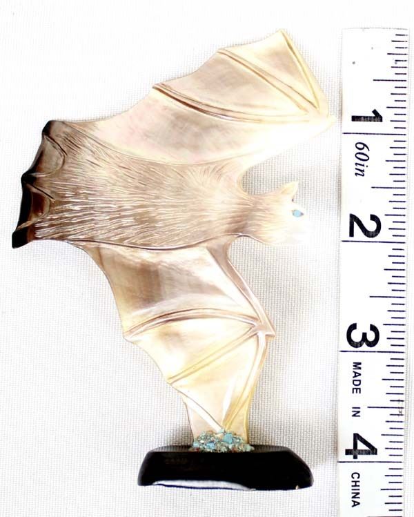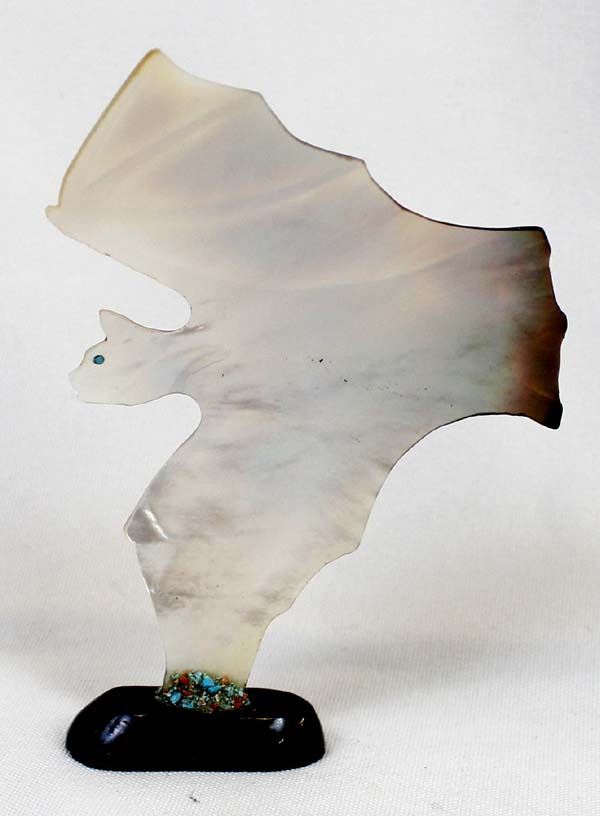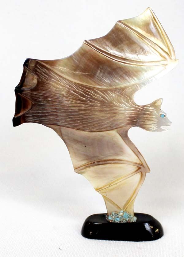 Native American Zuni Carved Abalone Bat Fetish by Yancy Robert Halusewa (deceased artist), measures 4''H x 2.75''W x .75''Deep, mounted on jet stand with turquoise chips around wing, turquoise eye