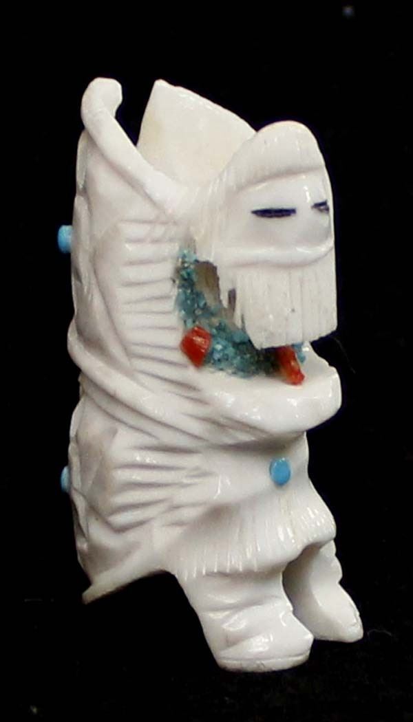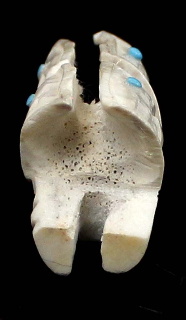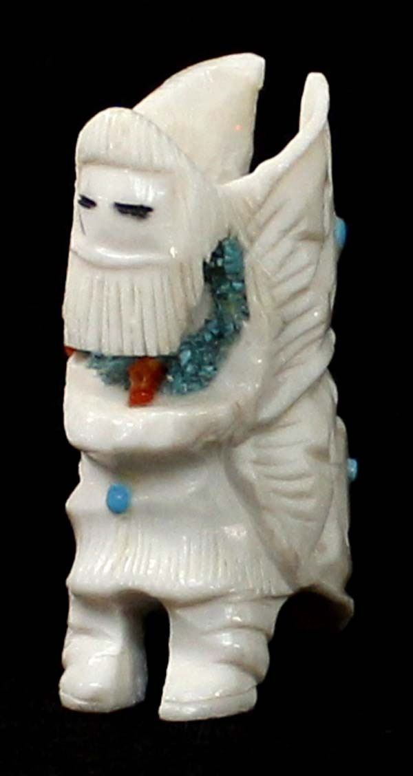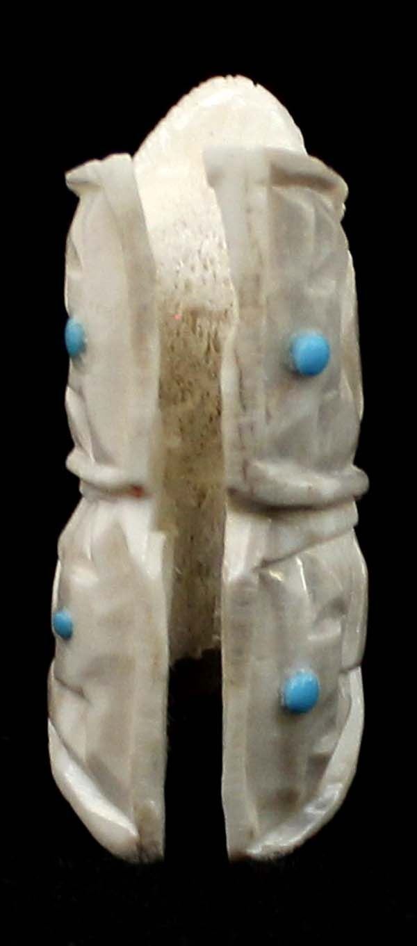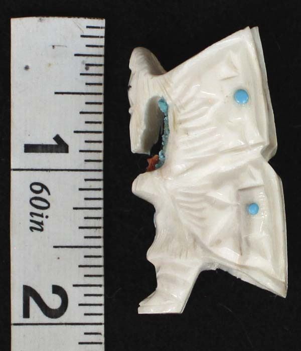 Native American Zuni Carved Antler Butterfly Maiden Fetish by Mel Lasoyeta, measures 1.5'' x .75'' x .5'', embellished with crushed turquoise, coral, and turquoise microdots, signed on the bottom MEL