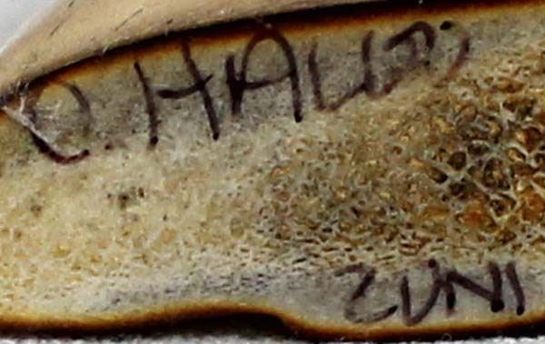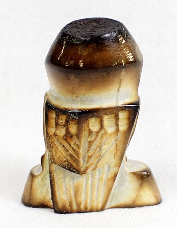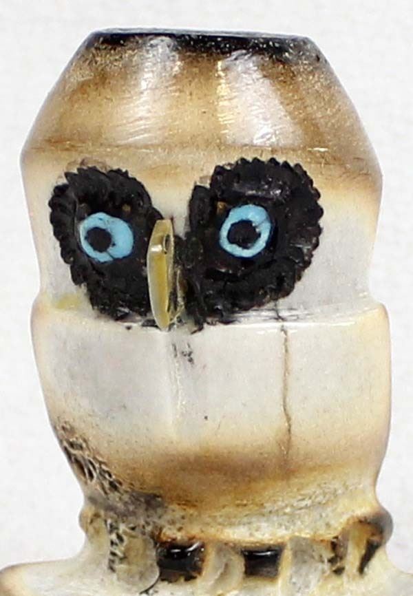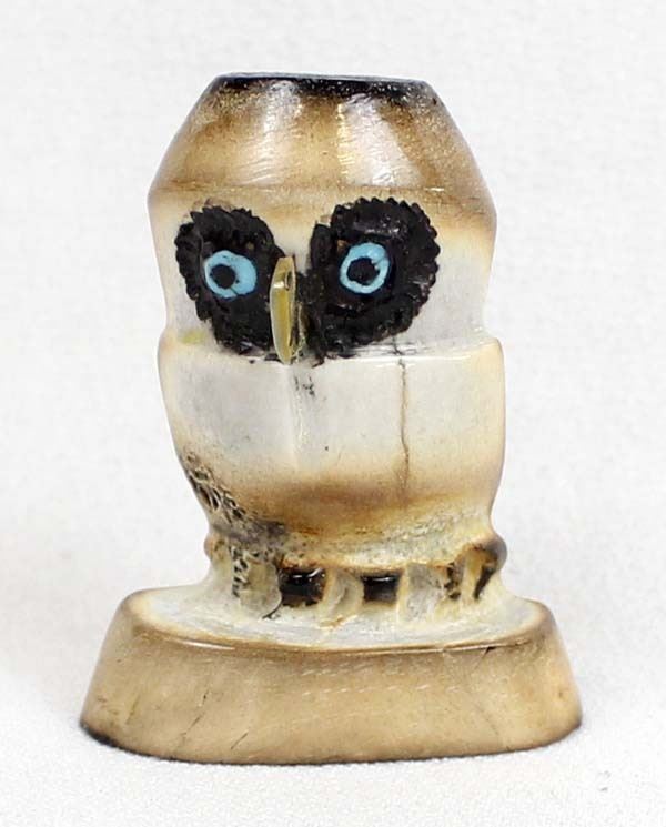 Native American Zuni Carved Antler Owl Fetish by Craig Haloo, measures 2'' x 1.5'' x .75'' and is signed on the bottom, turquoise and jet eyes, gold lip shell beak
