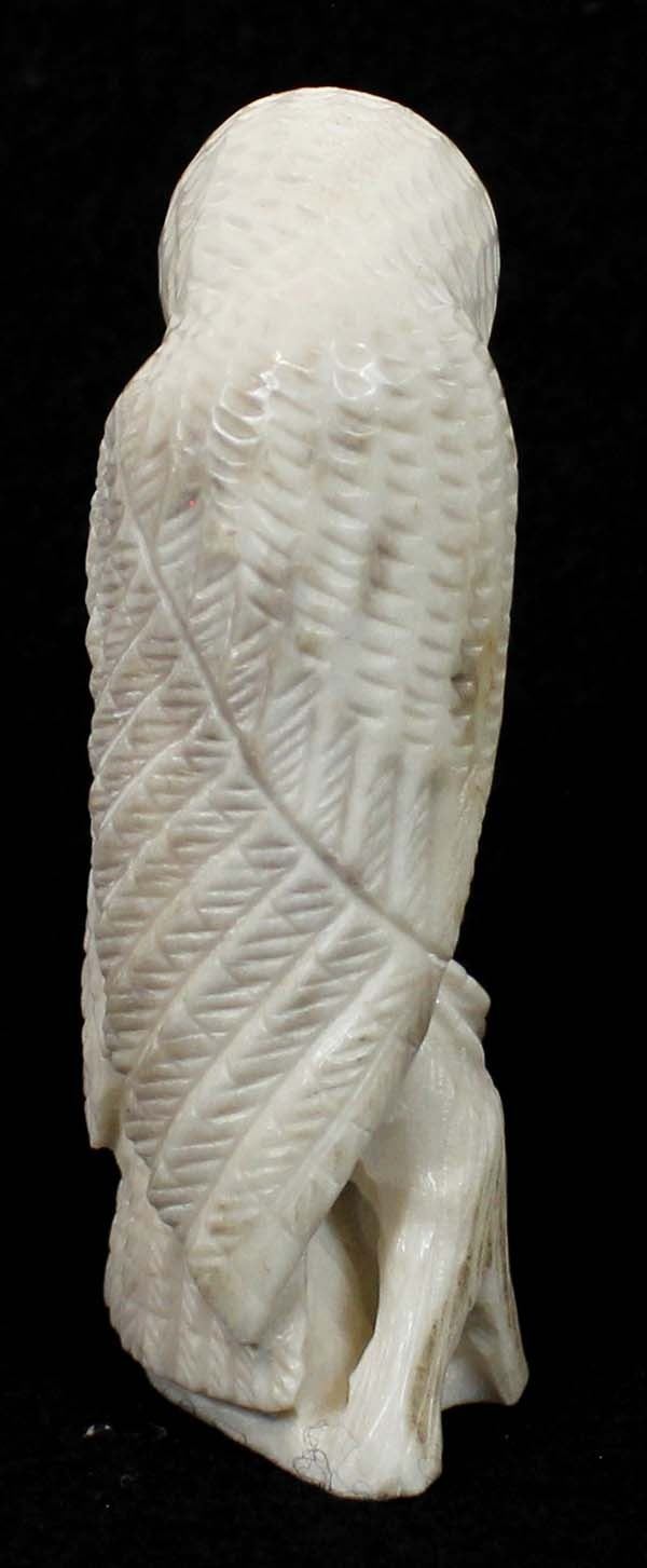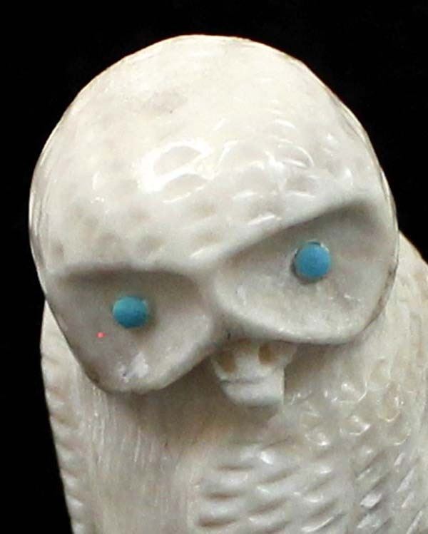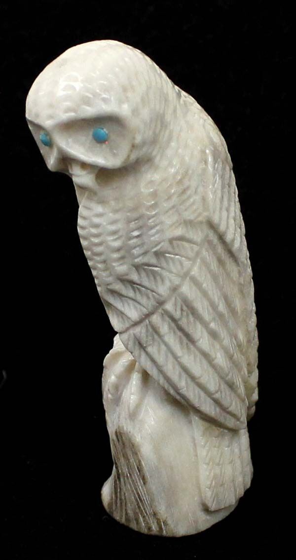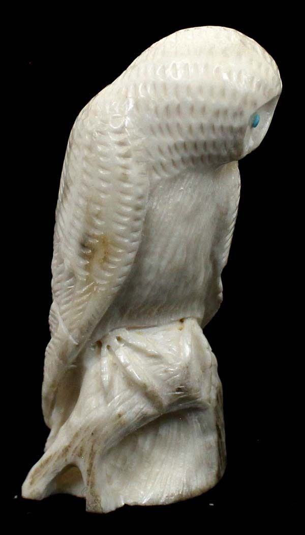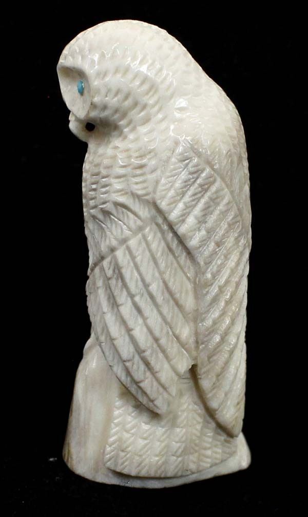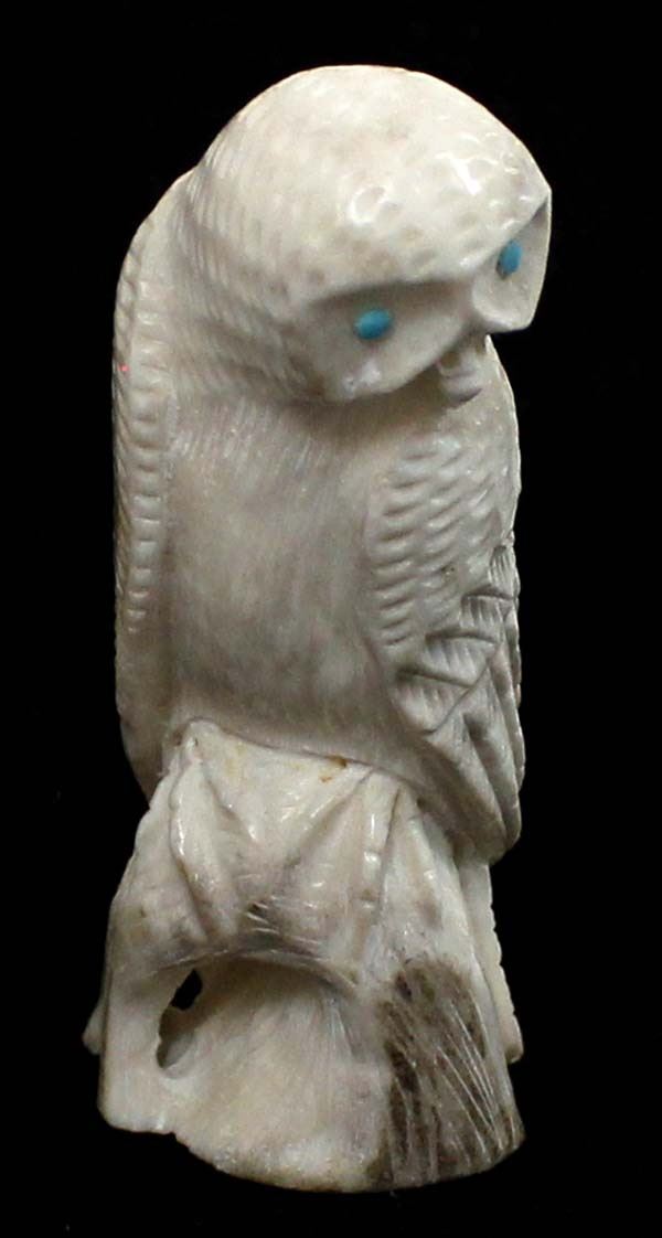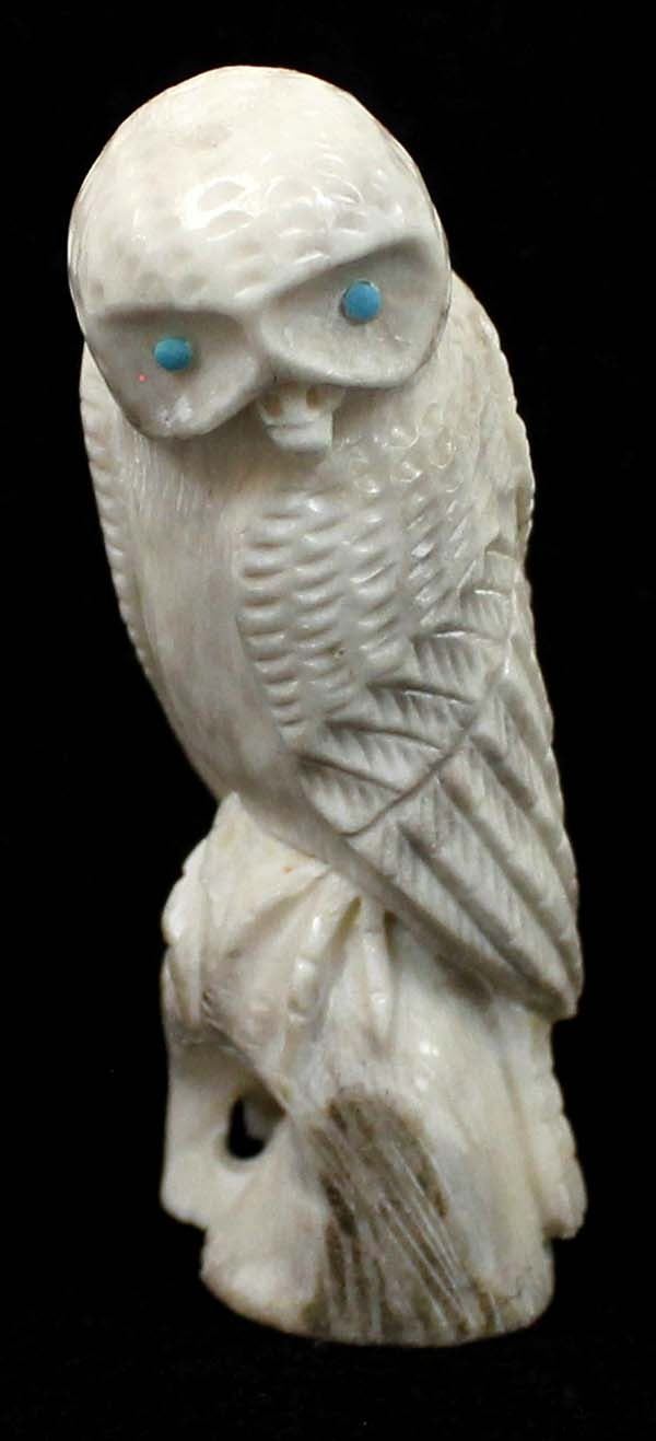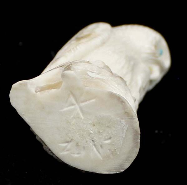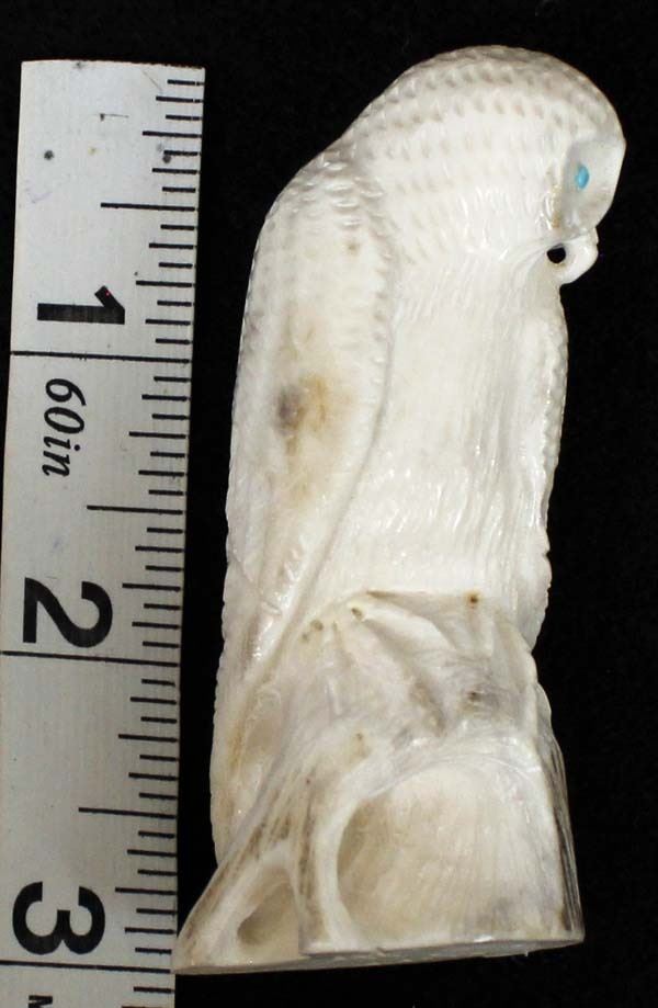 Native American Zuni Carved Antler Owl Fetish by Derrick Kaamasee, measures 3''L x 1.25'' and has artist's initials on the bottom, turquoise eyes