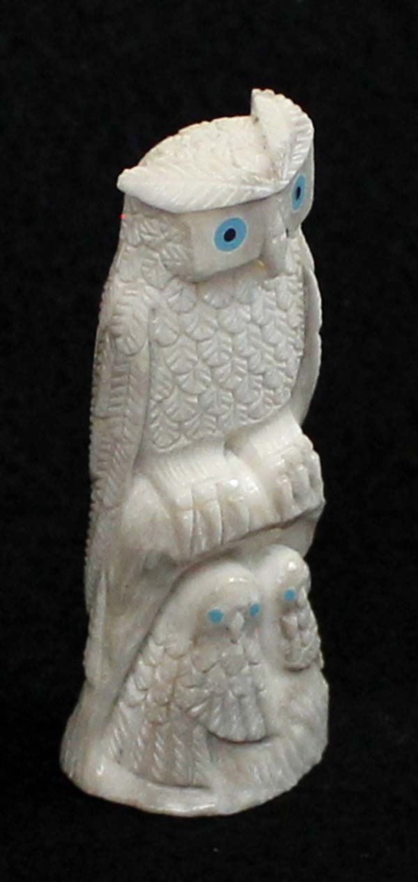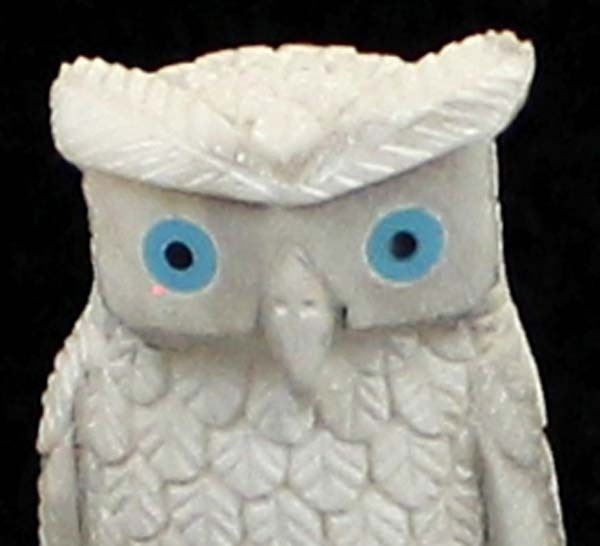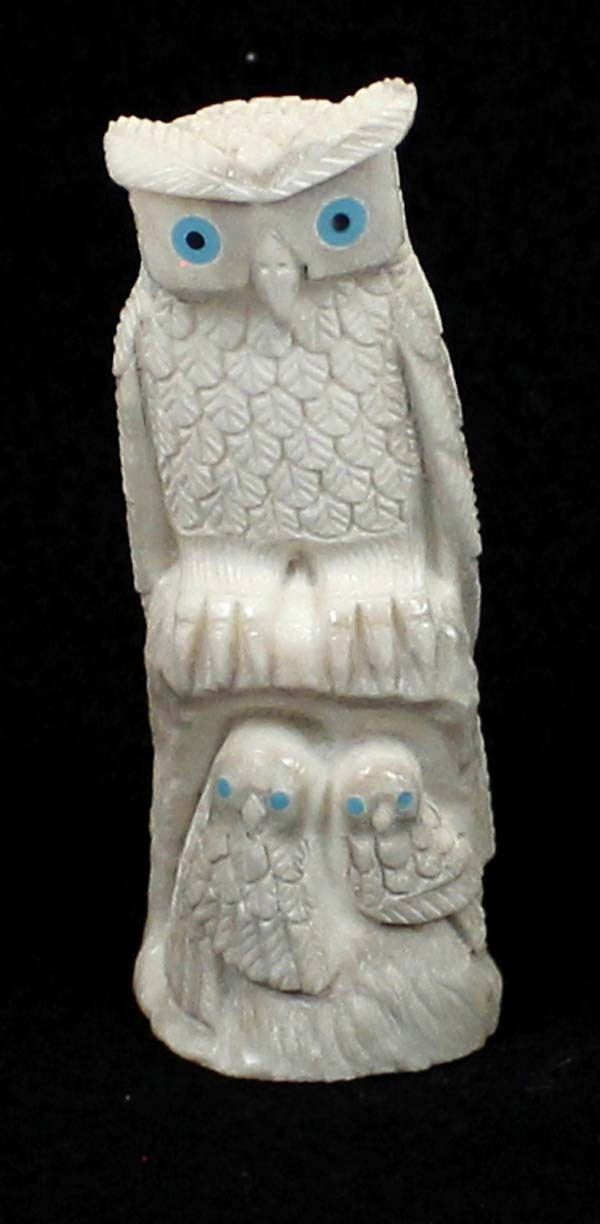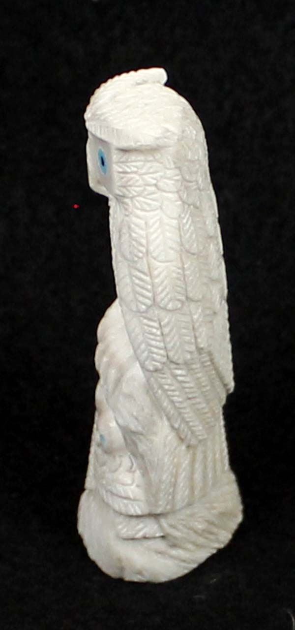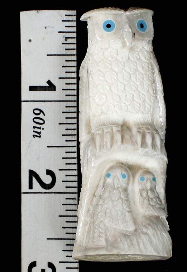 Native American Zuni Carved Antler Owl Fetish by Donna Siutza, measures 2.75”L x 1”W and has artist’s initials on the bottom, turquoise eyes