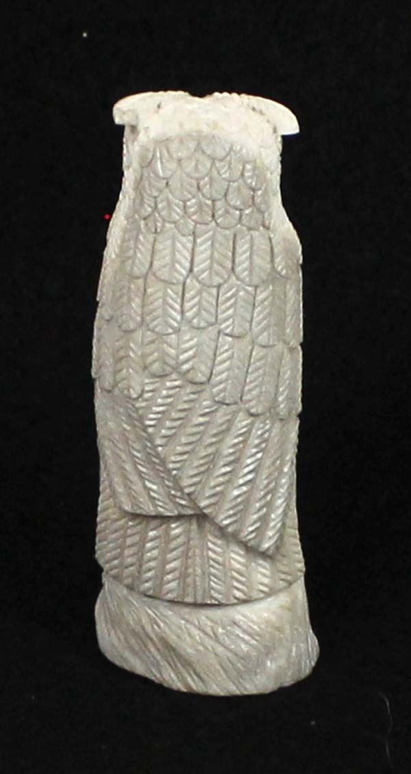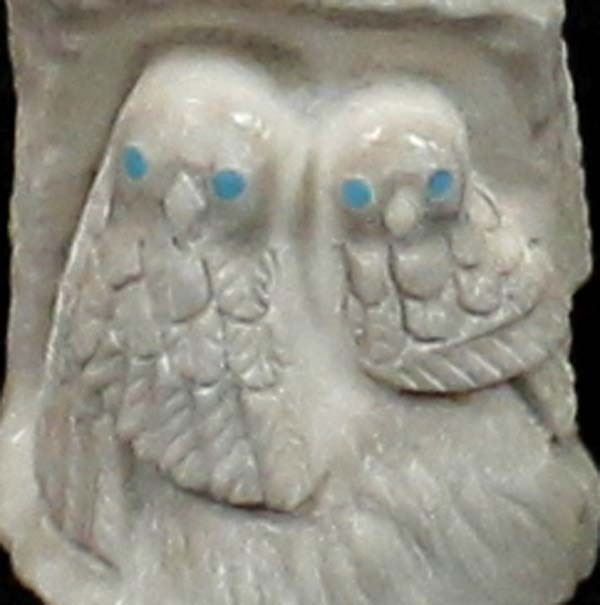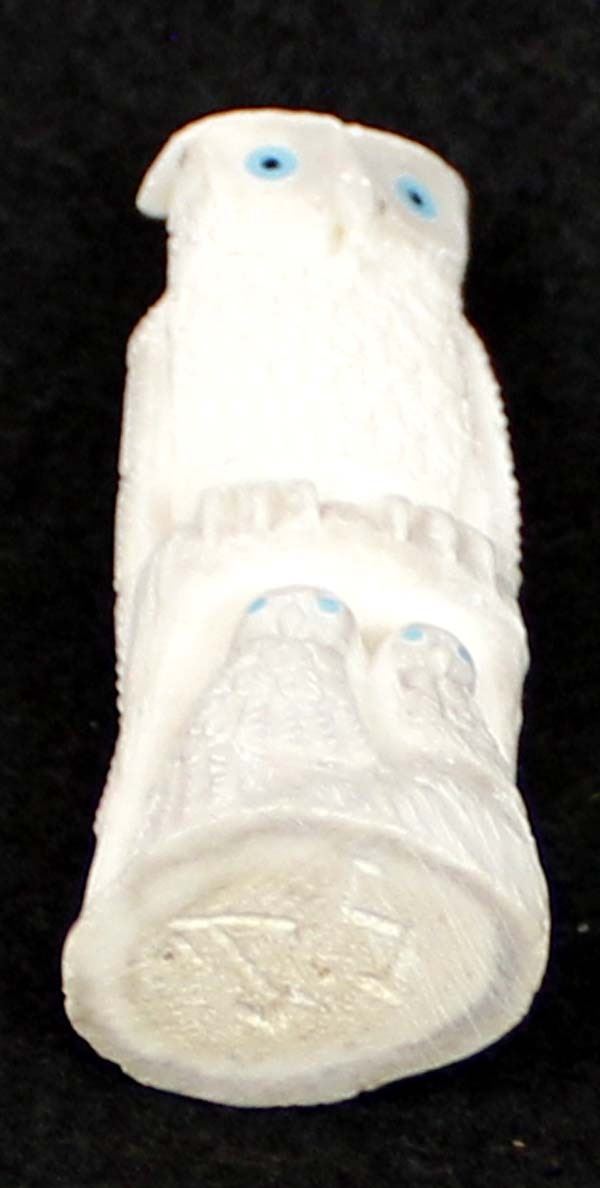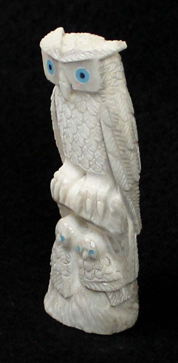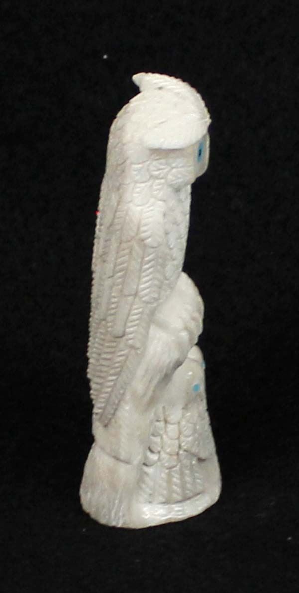 Native American Zuni Carved Antler Owl Fetish by Donna Siutza, measures 2.75”L x 1”W and has artist’s initials on the bottom, turquoise eyes