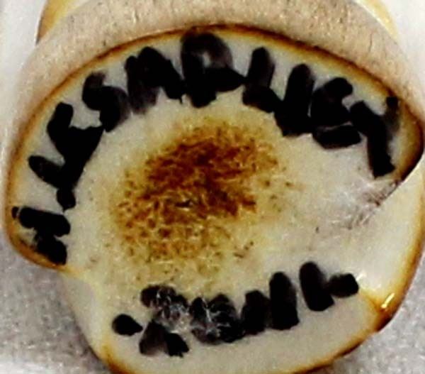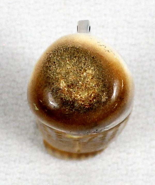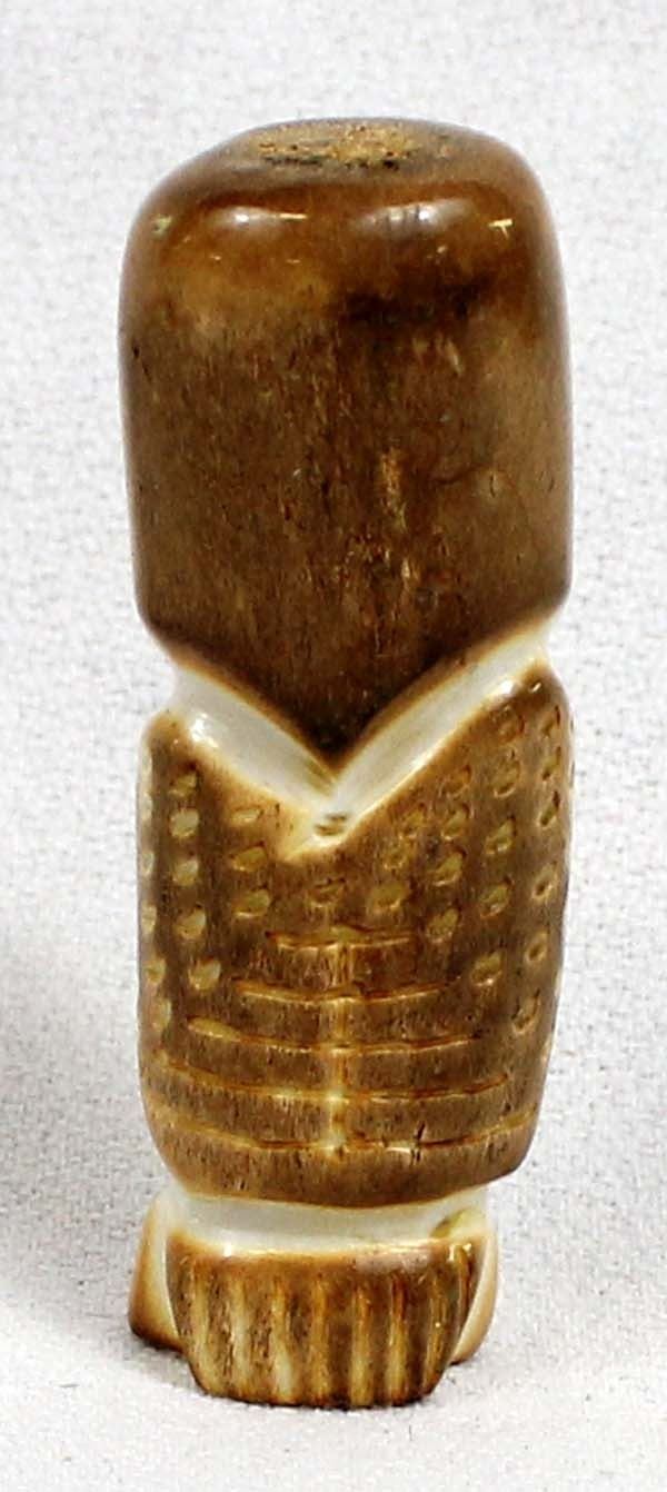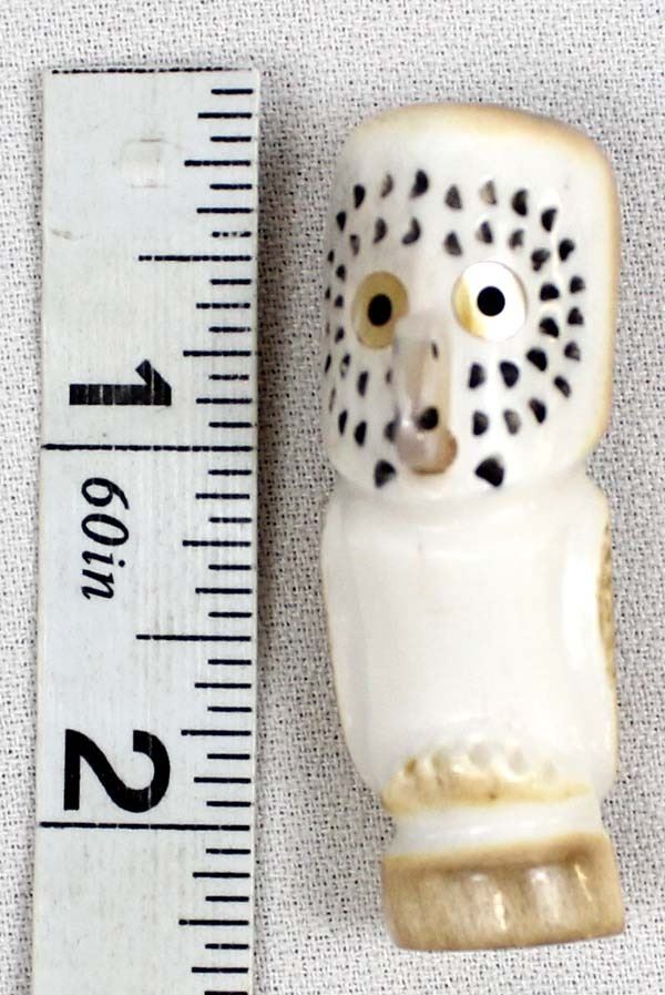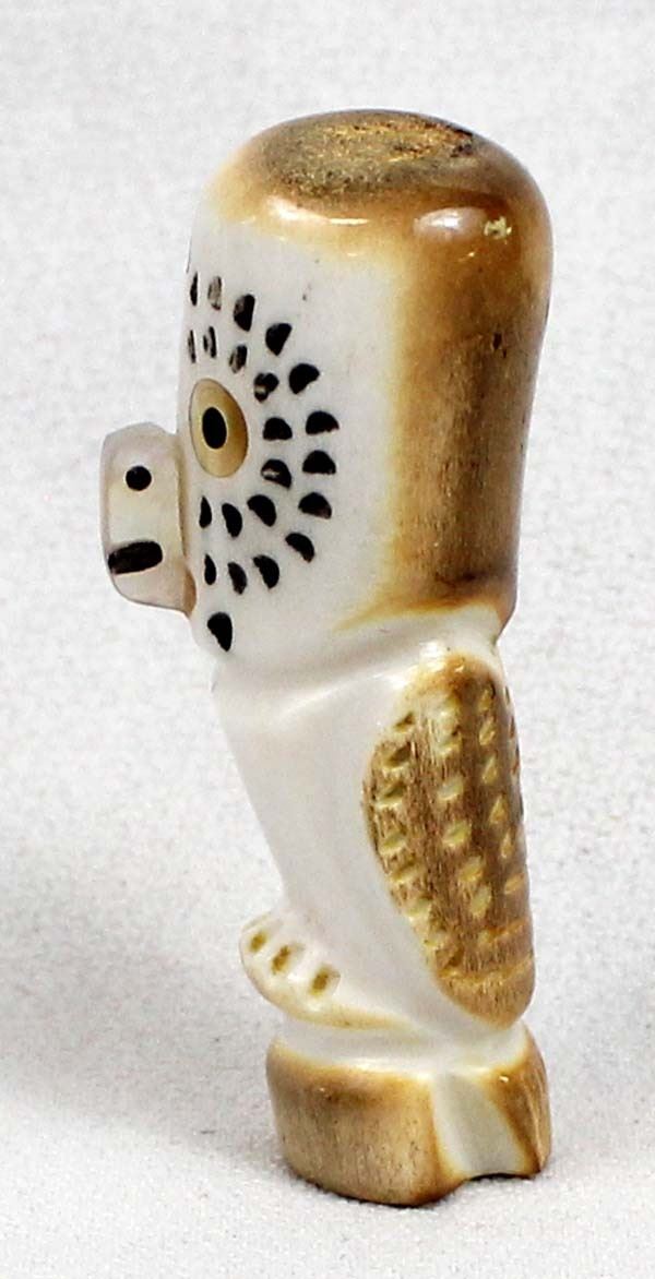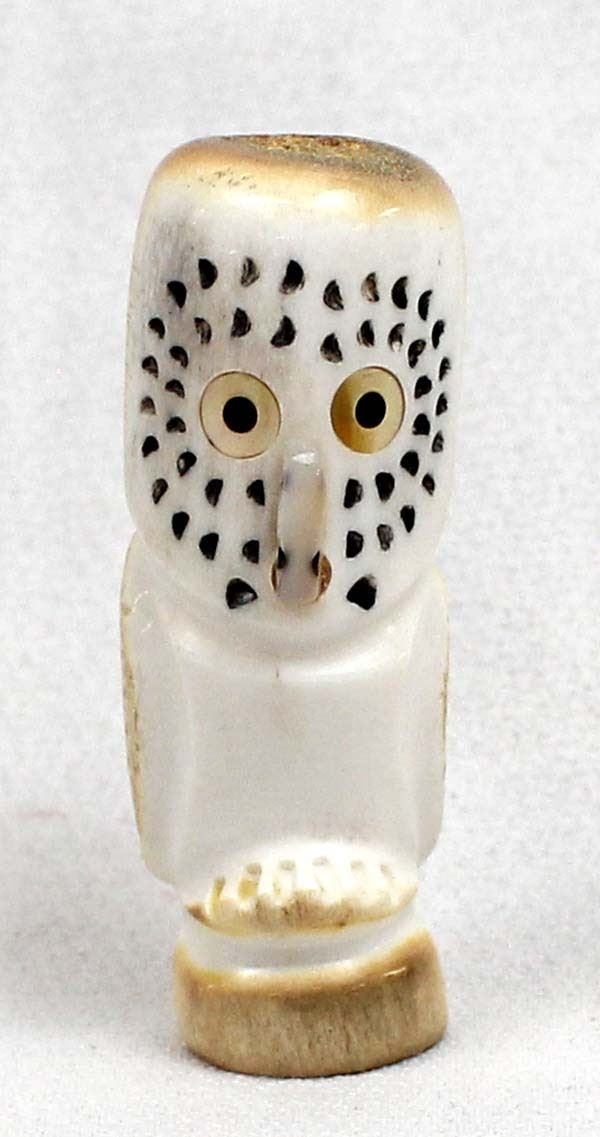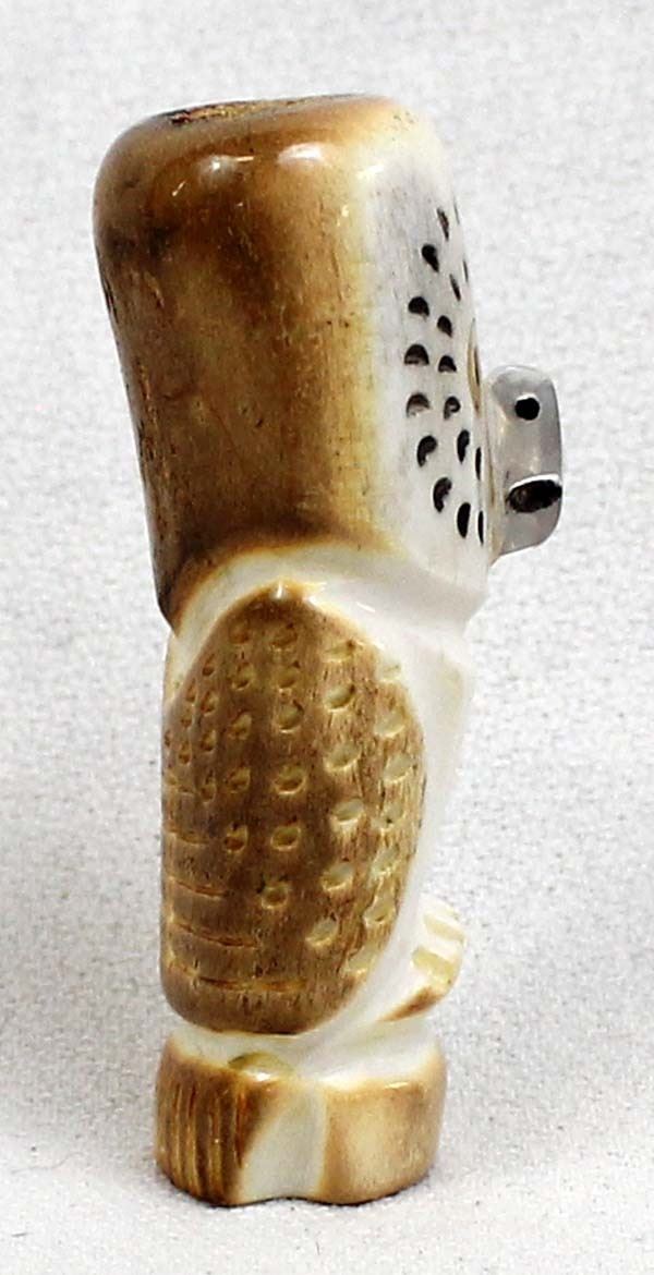 Native American Zuni Carved Antler Owl Fetish by Howard Lesarlley, measures 2'' x .75'' and is signed on the bottom, gold lip shell and jet eyes