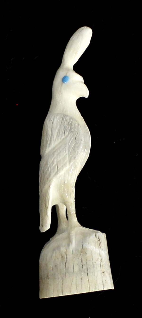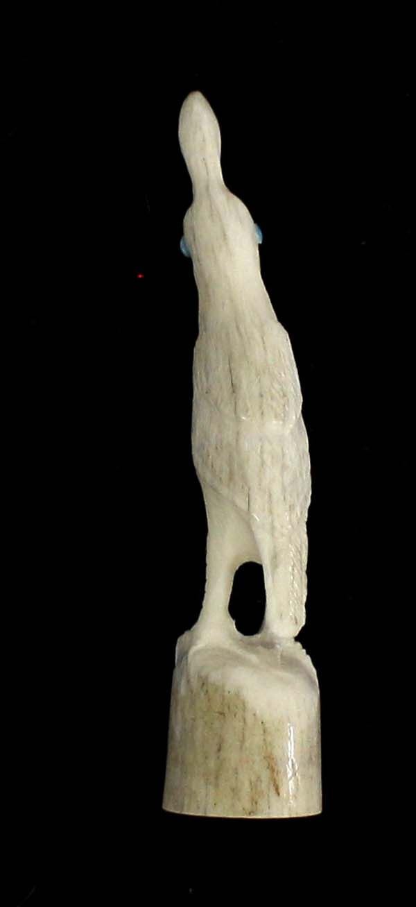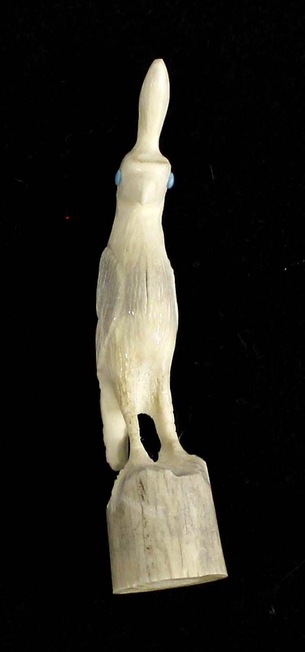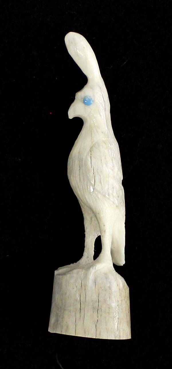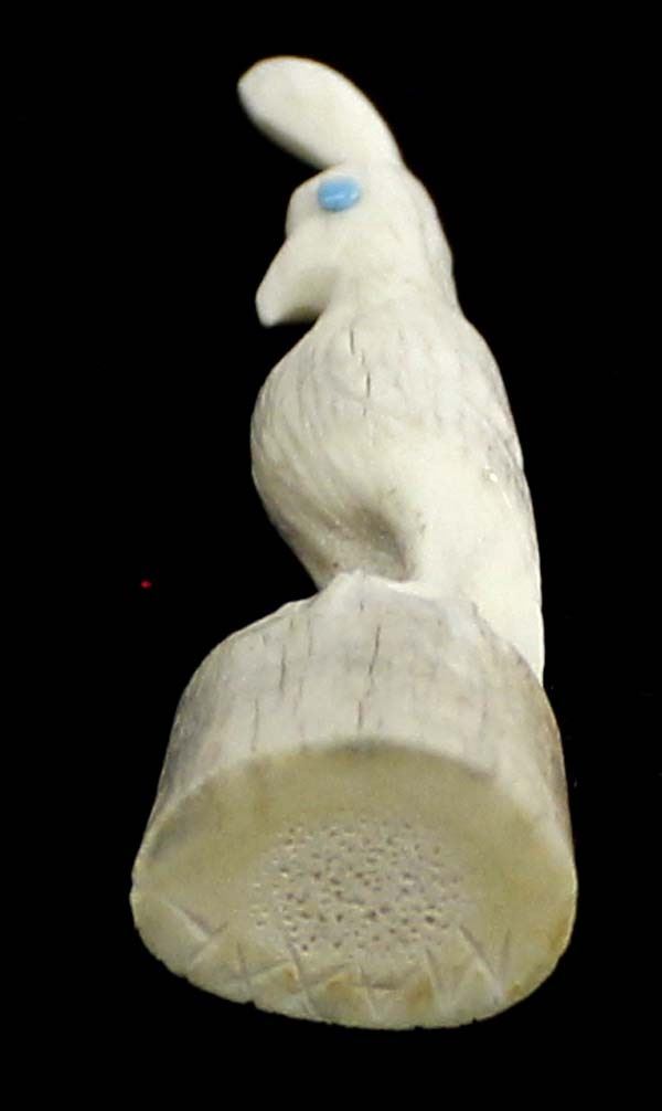Native American Zuni Carved Antler Quail Fetish by Maxx Laate, turquoise eyes, measures .5'' x 2'' and is signed on the bottom