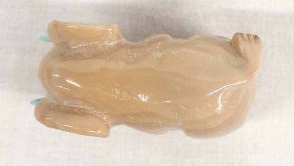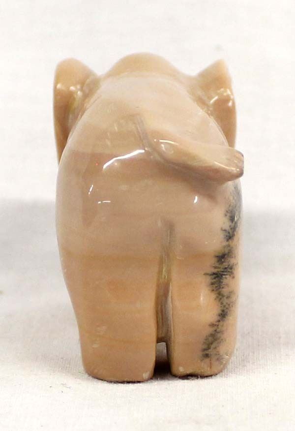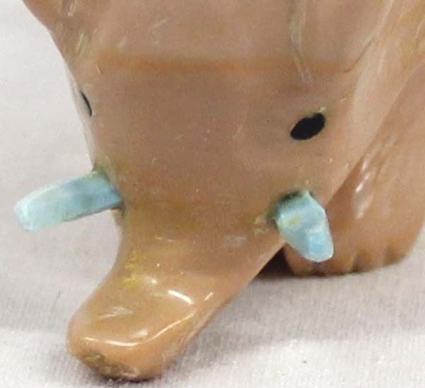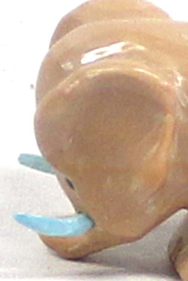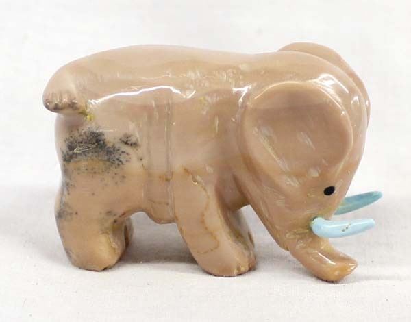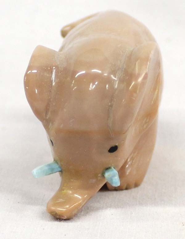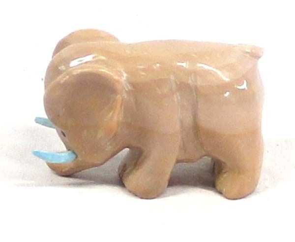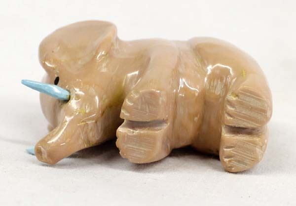 Native American Zuni Carved Dolomite Elephant with Turquoise Tusks by Fabian Tsethlikai, artist's initials F.T. on the bottom, measures 2'' x 1.5'' x 1''