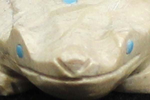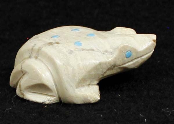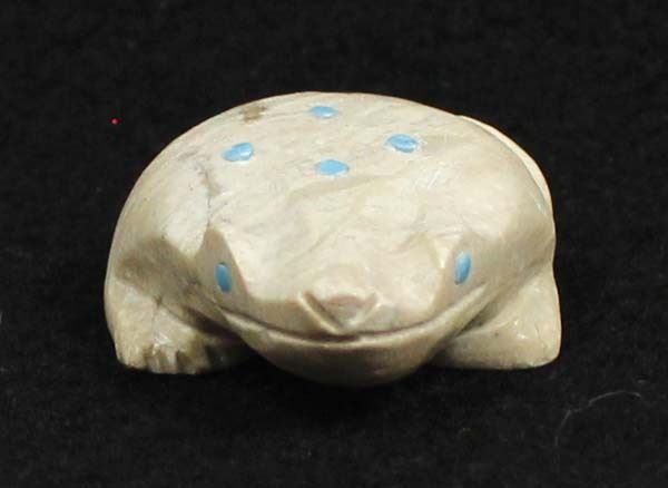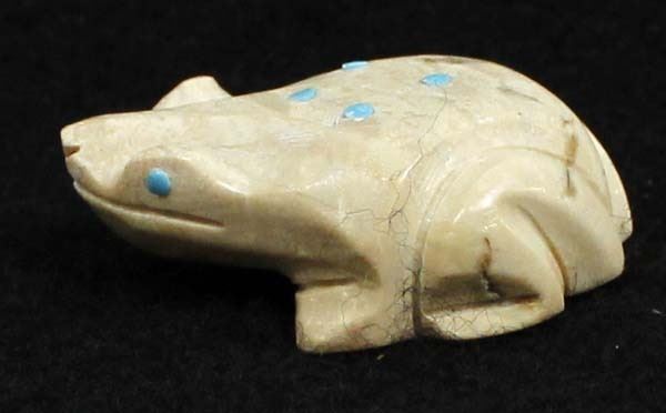 Native American Zuni Carved Fishrock Frog Fetish by Adrian Cachini, measures 1'' x 1.5'' x .25'', turquoise eyes and spots, artist's initials on the bottom