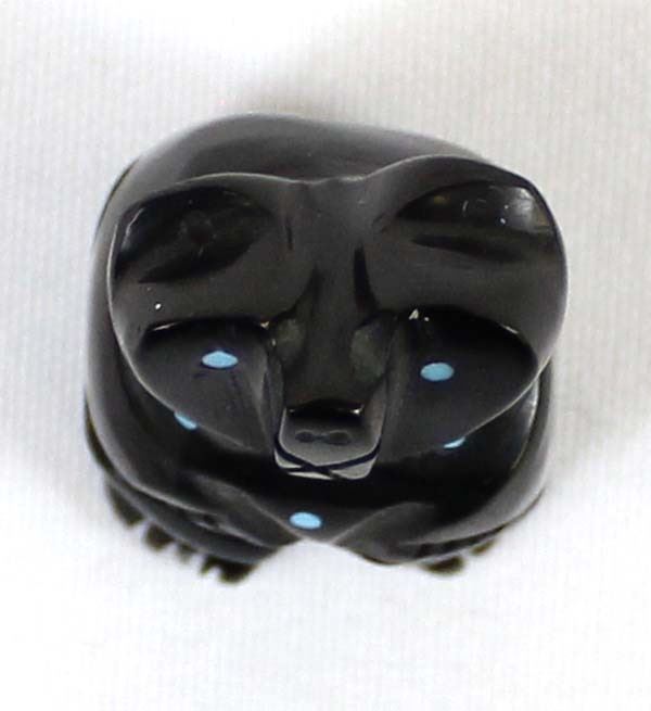 Native American Zuni Carved Bear Fetish by Alex Tsethlikai, measures 1'' x 1.75'' and has artist's initials on the bottom, turquoise eyes and necklace