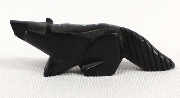 Native American Zuni Carved Jet Bushy Tail Fetish, measures 1'' x 3'', turquoise eyes and inlay turquoise spots on back, signed on the bottom