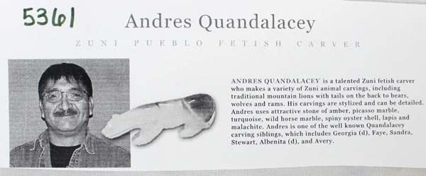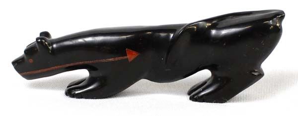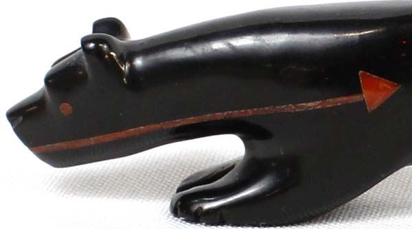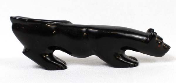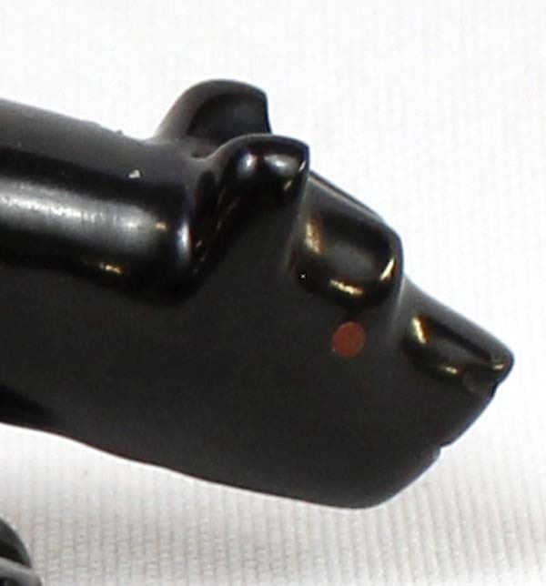 Native American Zuni Carved Jet Mountain Lion Fetish by Andres Quandelacy, measures .5'' x 1.25'' x 4'' and has coral eyes