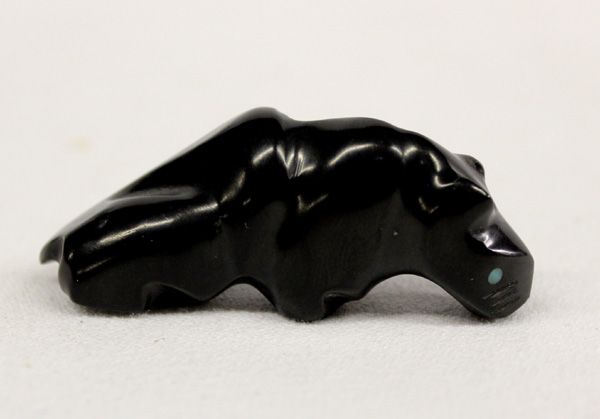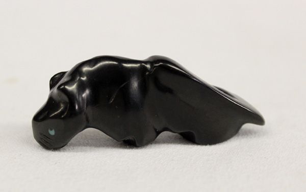 Zuni Carved Jet Mountain Lion Fetish by Justin R., measures 2.5in. L and has turquoise eyes