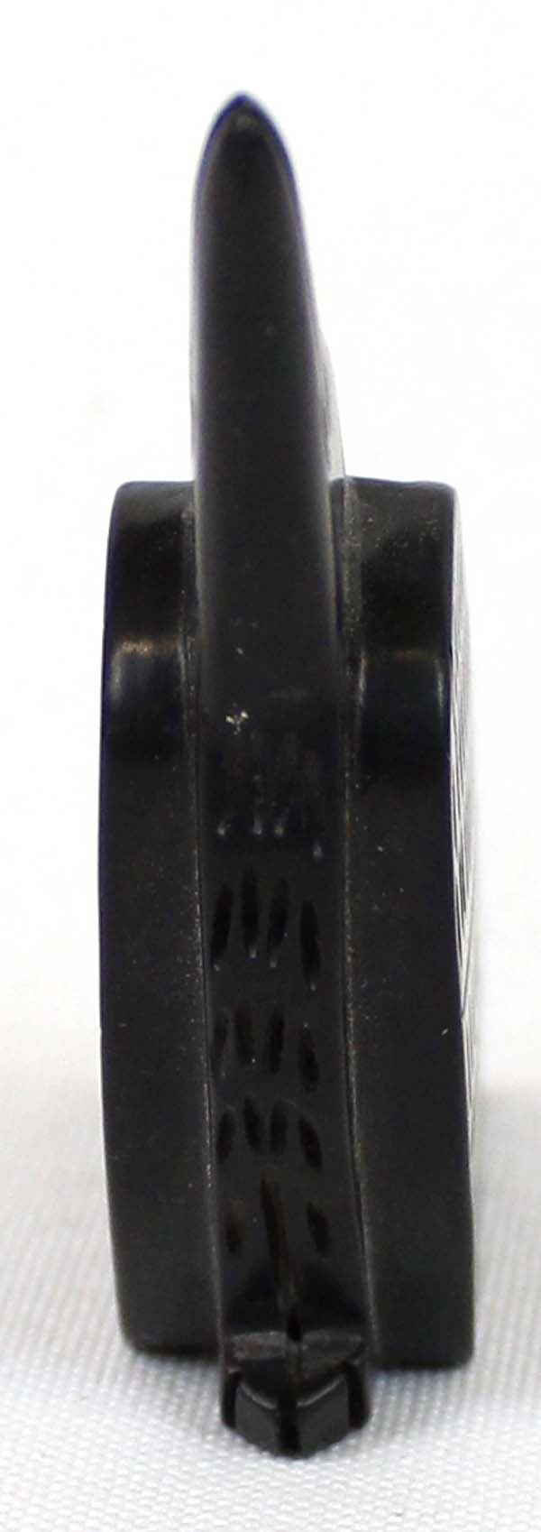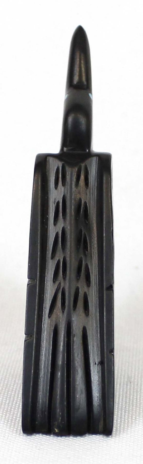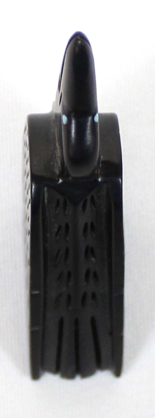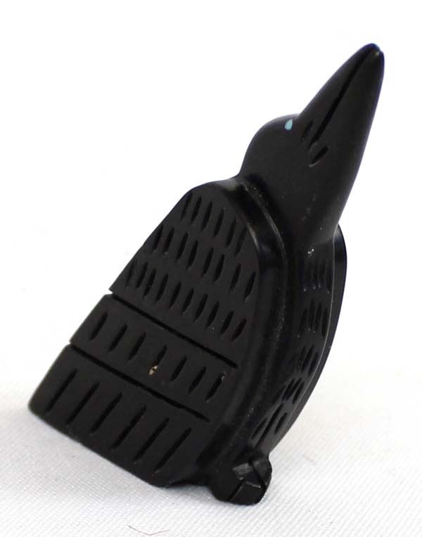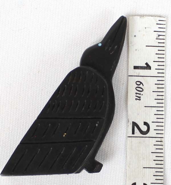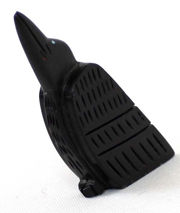 Native American Zuni Hand Carved Raven Fetish by Amos Pooacha (deceased artist) from the Zuni Pueblo in Western New Mexico. This fetish is beautifully carved into a piece of black Jet. The Raven features turquoise inlay eyes and hand etched wings.