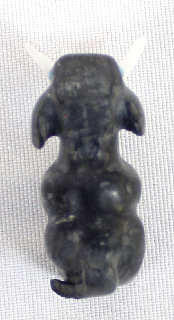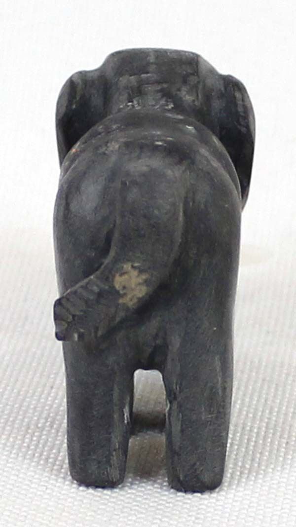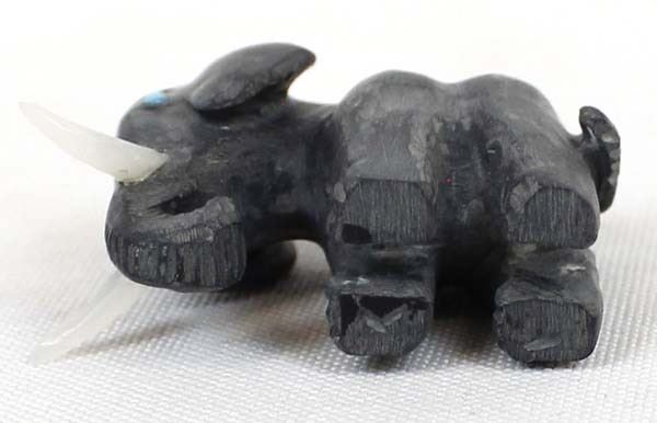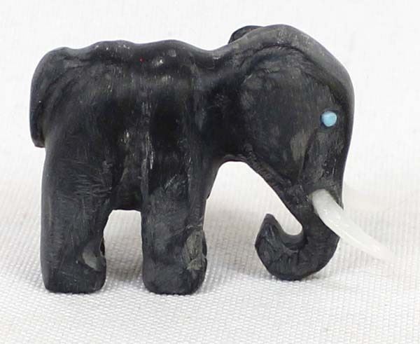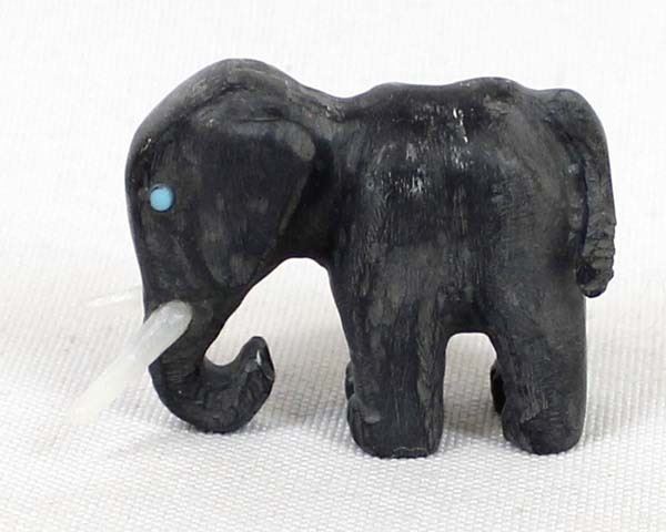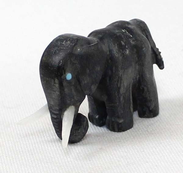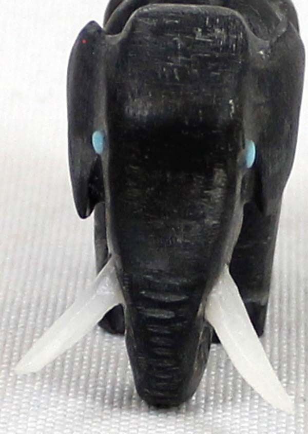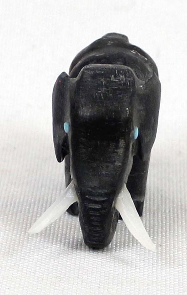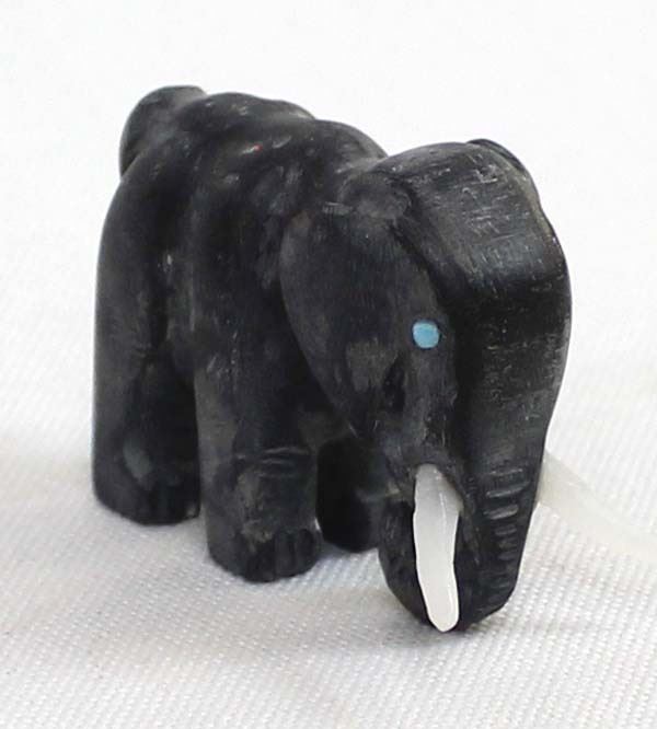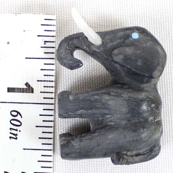 Native American Zuni Carved Marble Elephant Fetish, measures 1.75'' x 1'' and has artist's initials ML on the bottom, mother of pearl tusks and turquoise eyes, left tusk has been glued