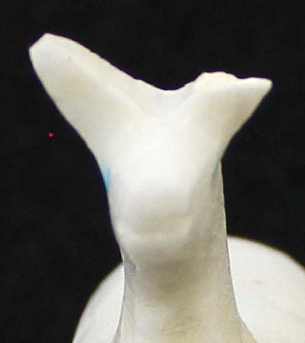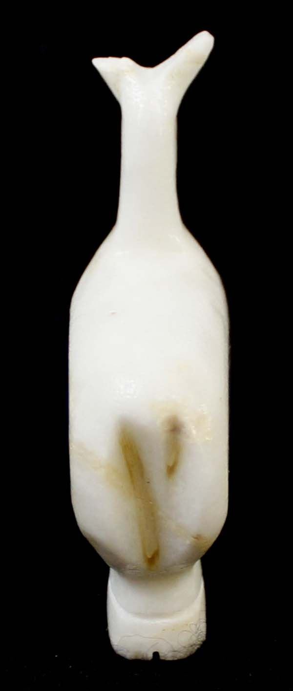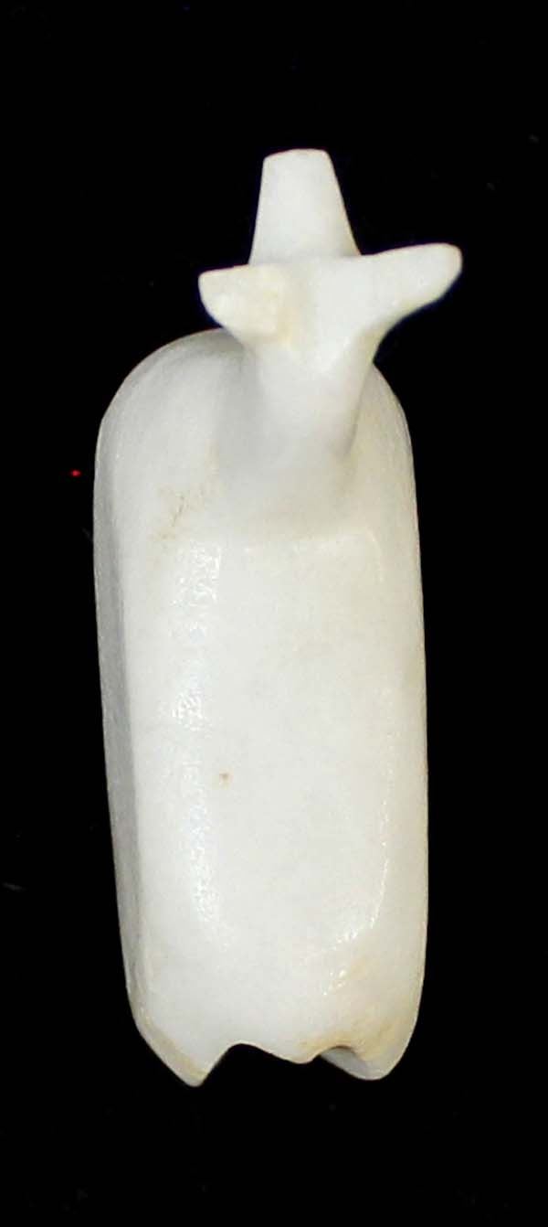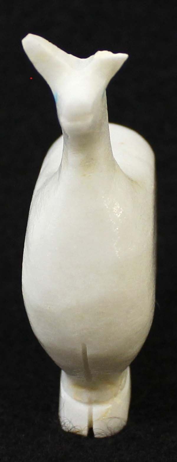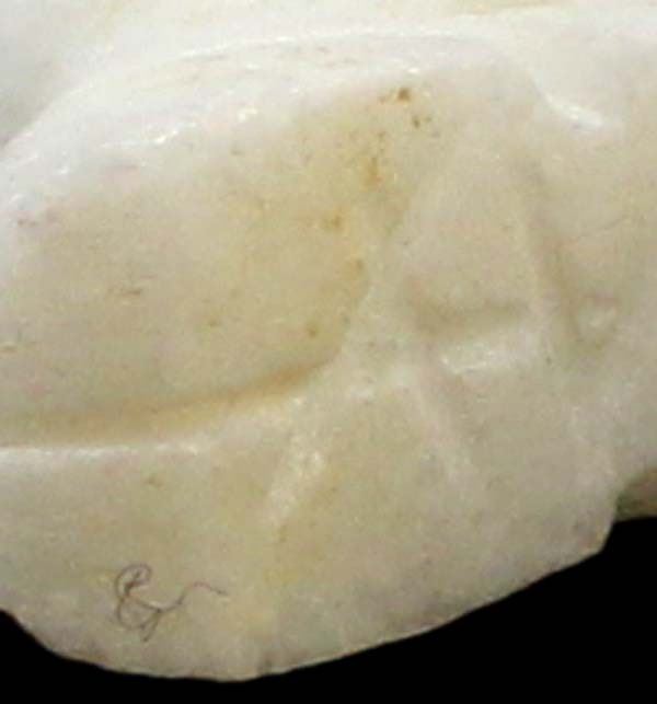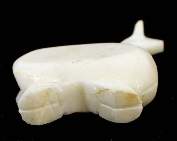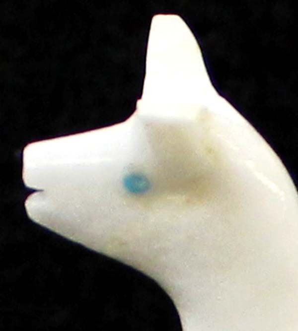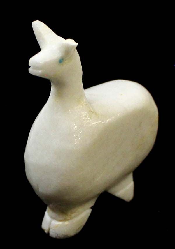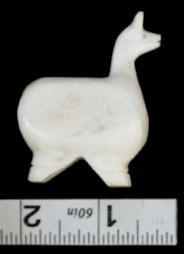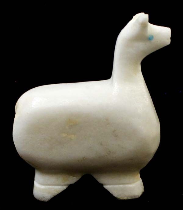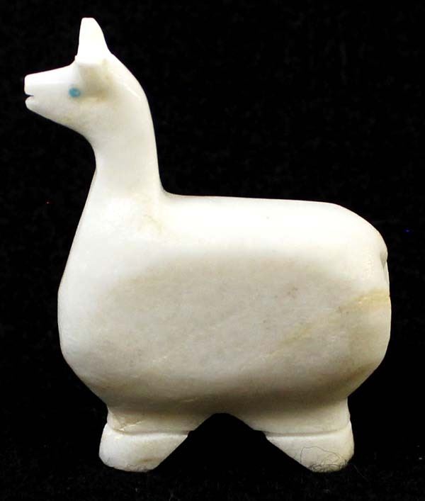 Native American Zuni Carved White Marble Llama Fetish by Tim Lementino, measures .5'' x 2'' x 1.5'', left ear is broken, turquoise eyes, has artist's initials on the bottom