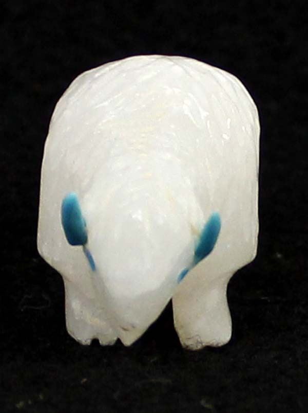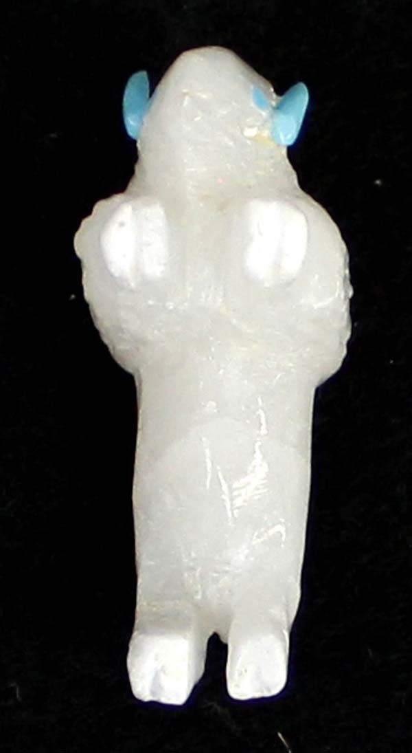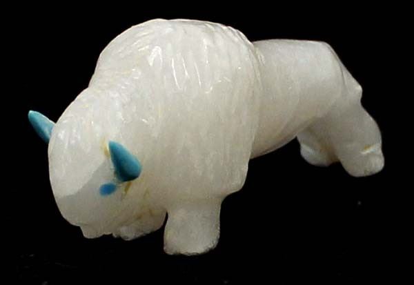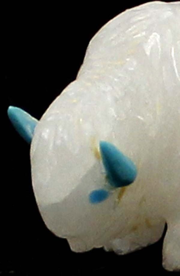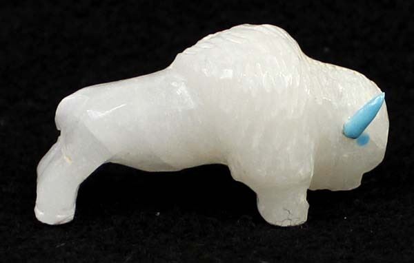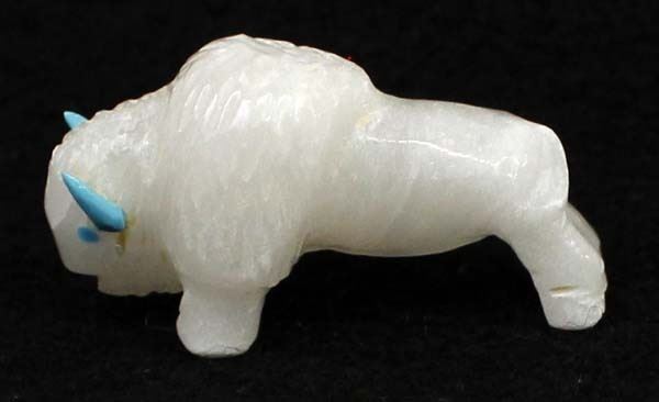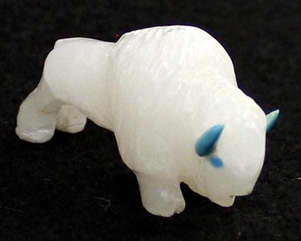 Native American Zuni Carved Mother of Pearl Buffalo Fetish with Turquoise Horns and Eyes, measures 1.75''L x 5/8''W x .75''H, unsigned, possible artist Andres Quandelacy