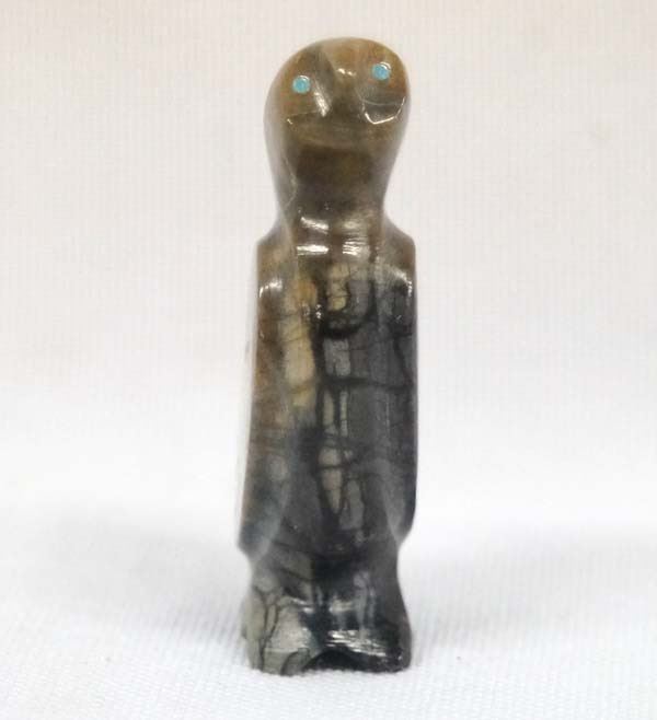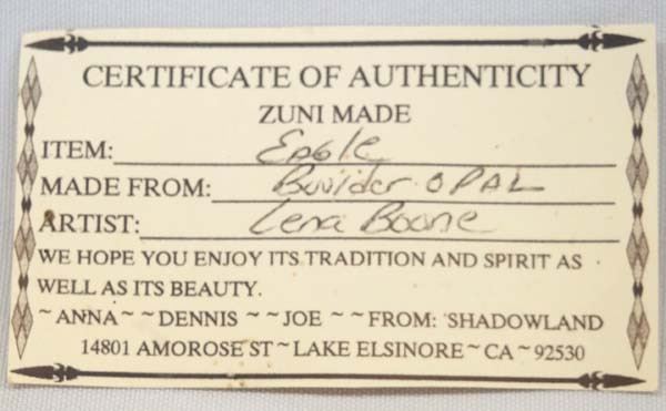 Native American Zuni Carved Picasso Marble Eagle Fetish by Lena Boone, measures 1.5''H x .75''W, comes with COA and signed by artist, turquoise eyes