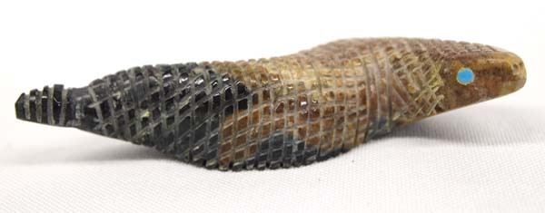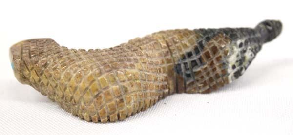 Native American Zuni Carved Picasso Marble Rattlesnake by Farlan Quam, measures .5'' x 3.5''L x .5'', signed by artist