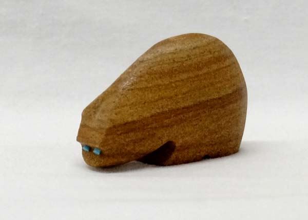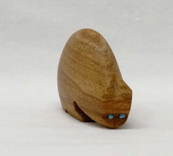 Zuni Carved Sandstone Bear Fetish, measures 2'' x 1.5'', turquoise eyes