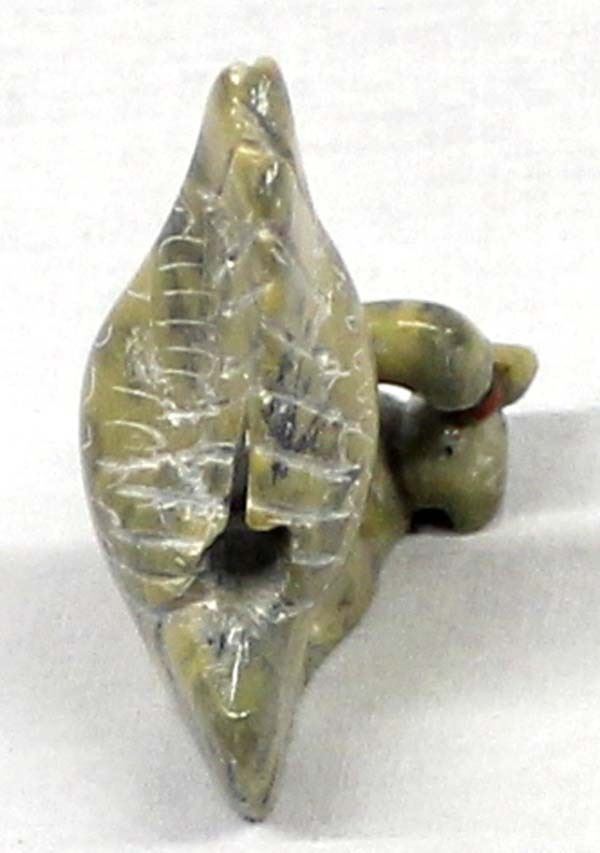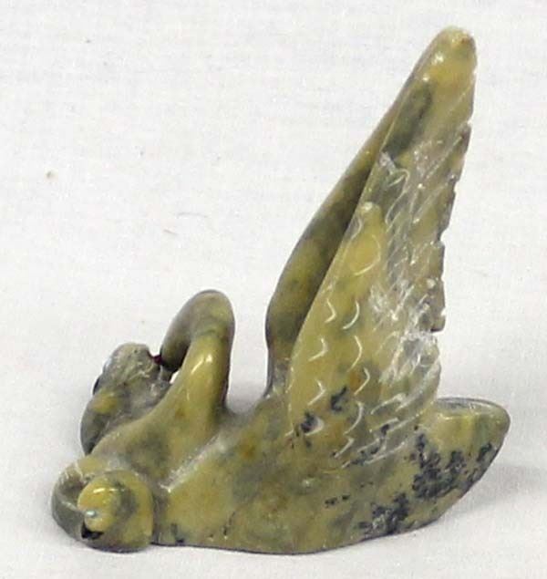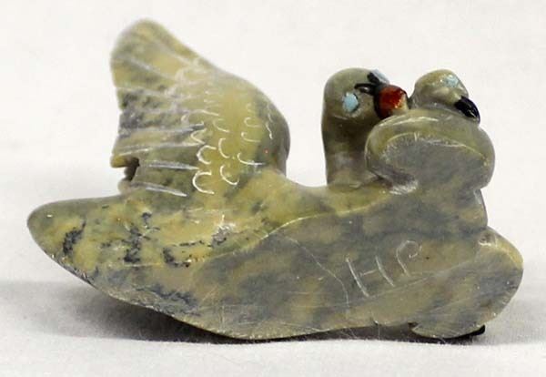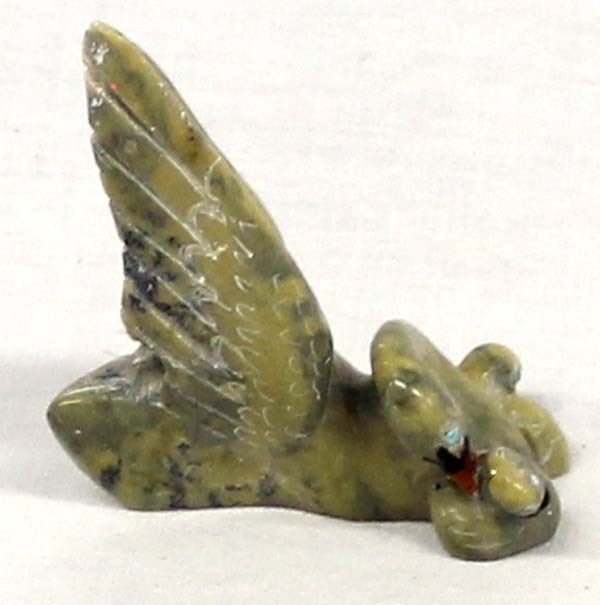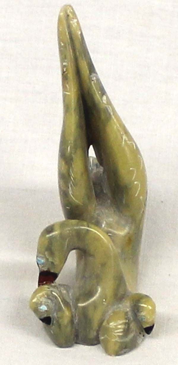 Native American Zuni Carved Serpentine Swan by Jonas Hustito, measures 1'' x 2.5'' x 2.5'', artist's initials on the bottom, turquoise eyes, coral and jet beaks