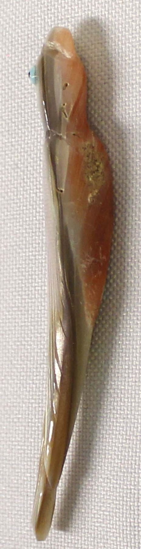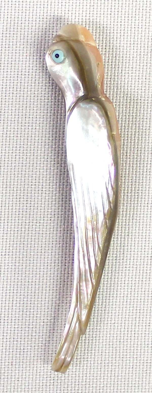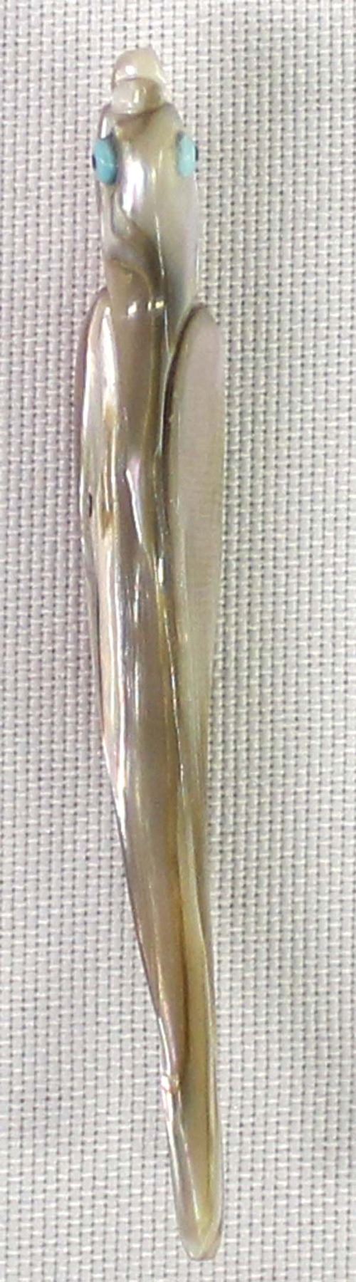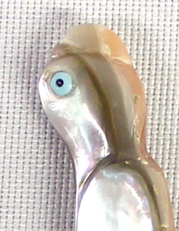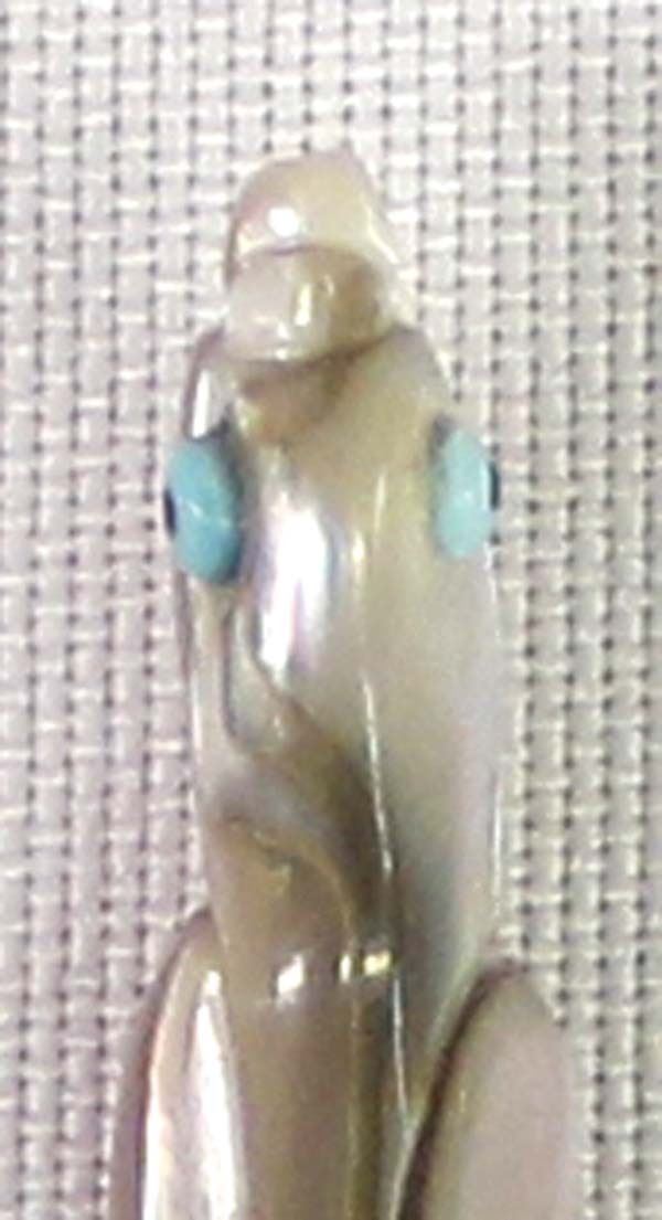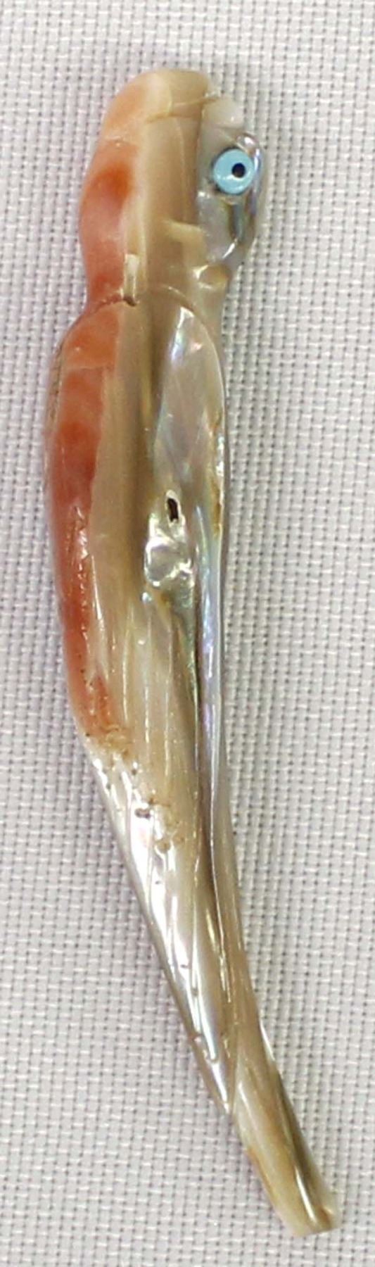 Native American Zuni Carved Shell Parrot Fetish by Ricky Laahty, measures .25'' x 2.25''L and has turquoise eyes, signed on the bottom