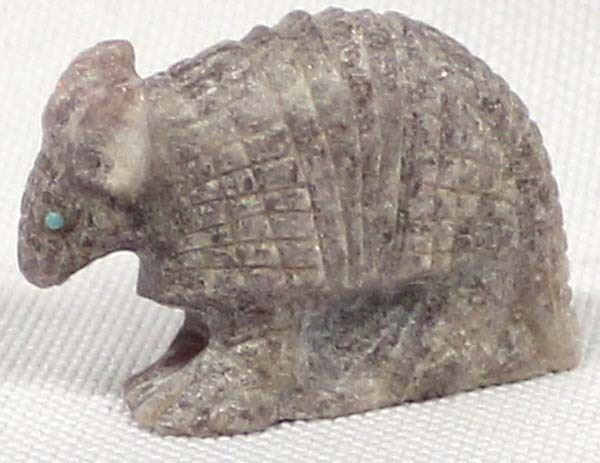 Native American Zuni Carved Stone Armadillo Fetish, measures .25'' x 1'' x .75'' and is hallmarked on the bottom, turquoise eyes