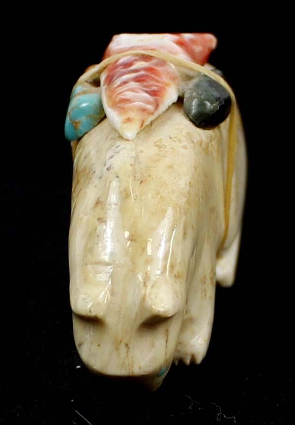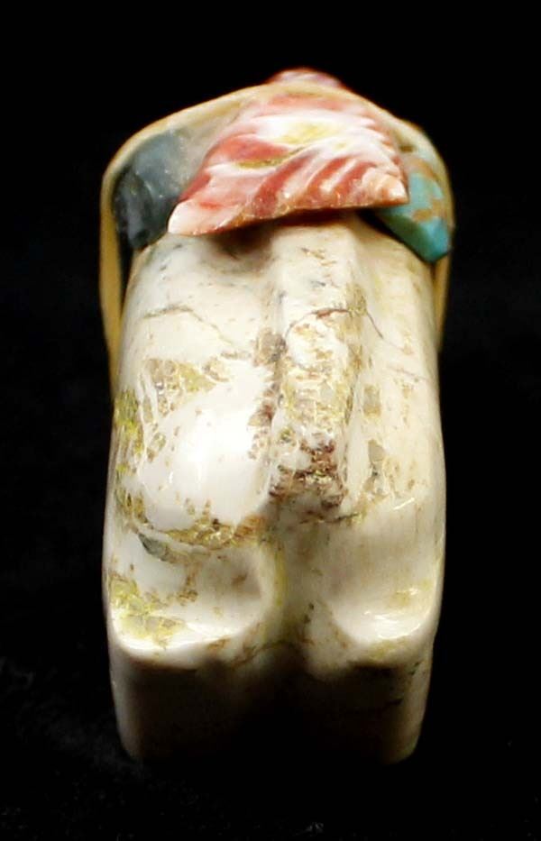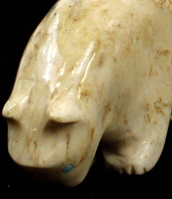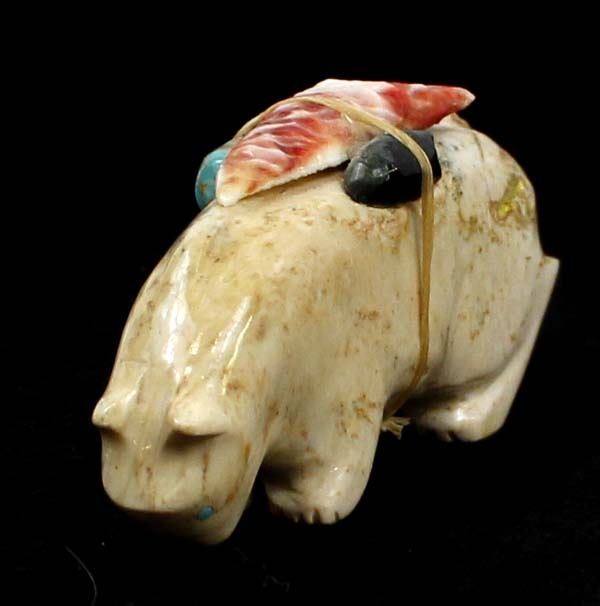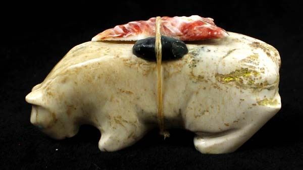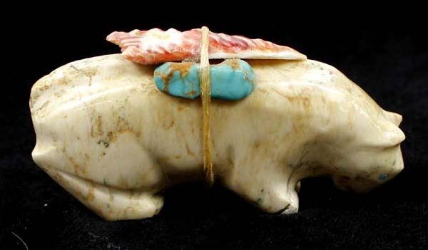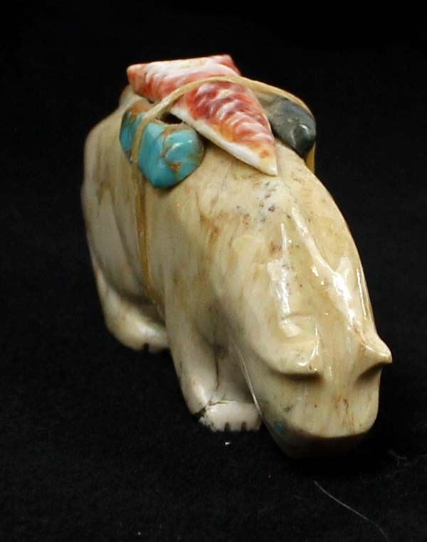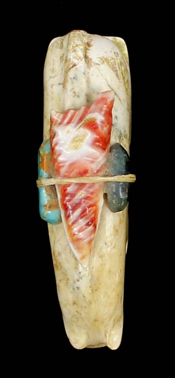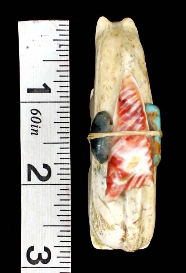 Native American Zuni Carved Stone Mountain Lion Fetish by Priscilla Lasiloo and Stewart Quandelacy, measures 1.5'' x .5'' x 2.75'', carved shell arrowhead, turquoise, and obsidian spirit bundle, unsigned