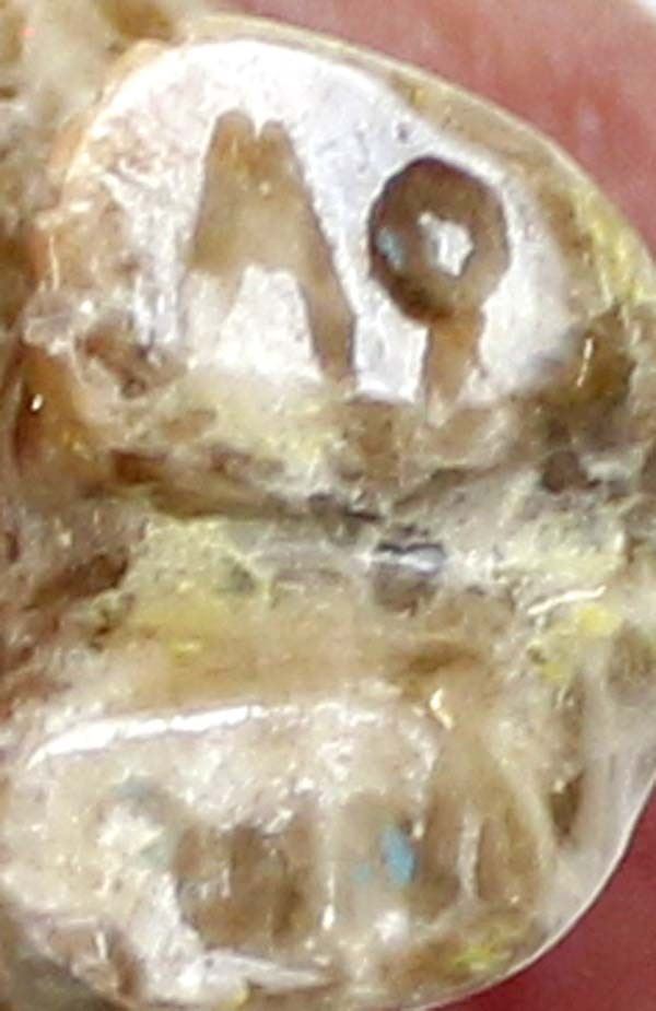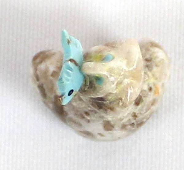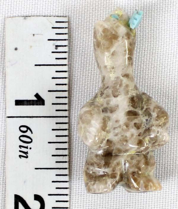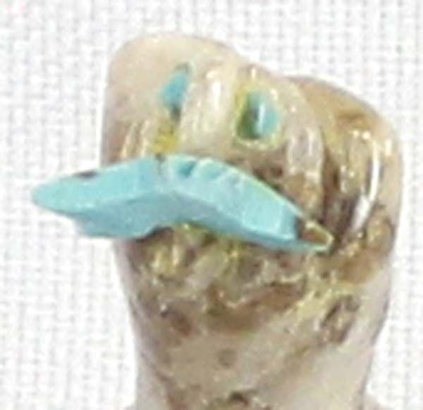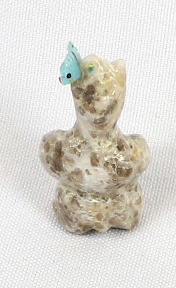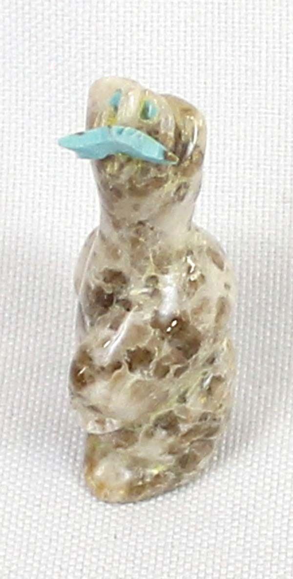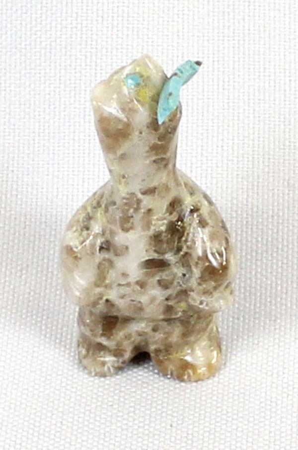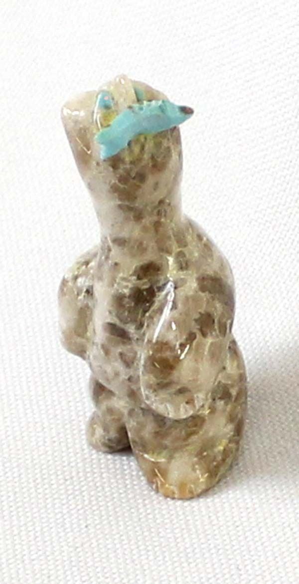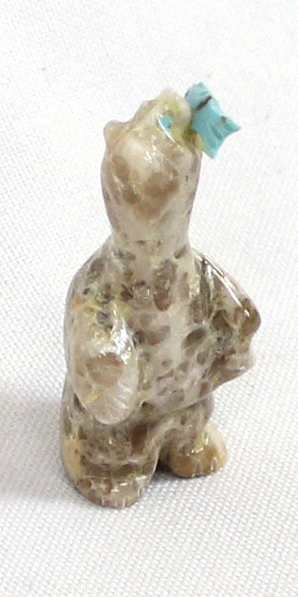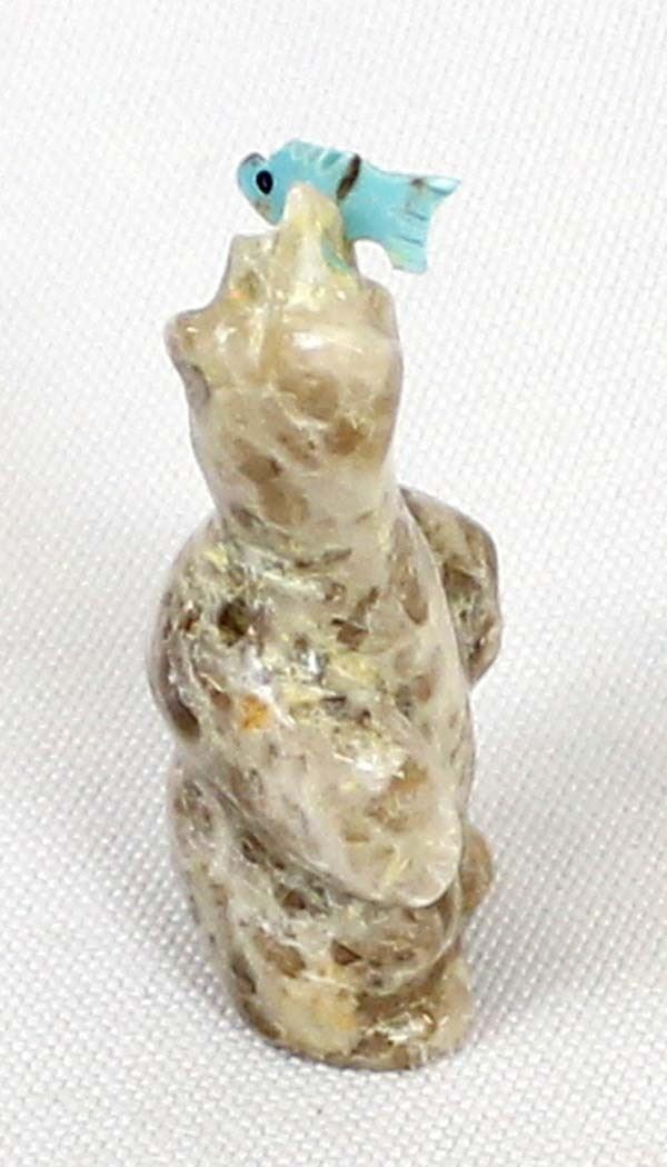 Native American Zuni Carved Stone Standing Bear Fetish by Andres Quam, measures 1.75'' x 1'' x .5'' and has artist's initials on the bottom, has carved turquoise fish in its mouth
