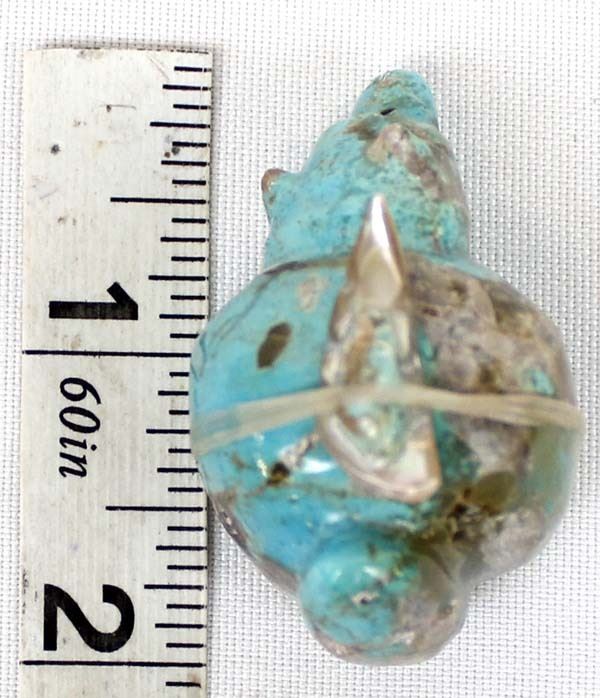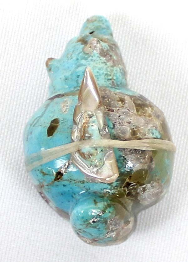 Native American Zuni Carved Turquoise Bear Fetish by Freddie Leekya, measures 2'' x 1.5'' x 1'' and is unsigned, jet eyes, abalone arrowhead and turquoise spirit bundle